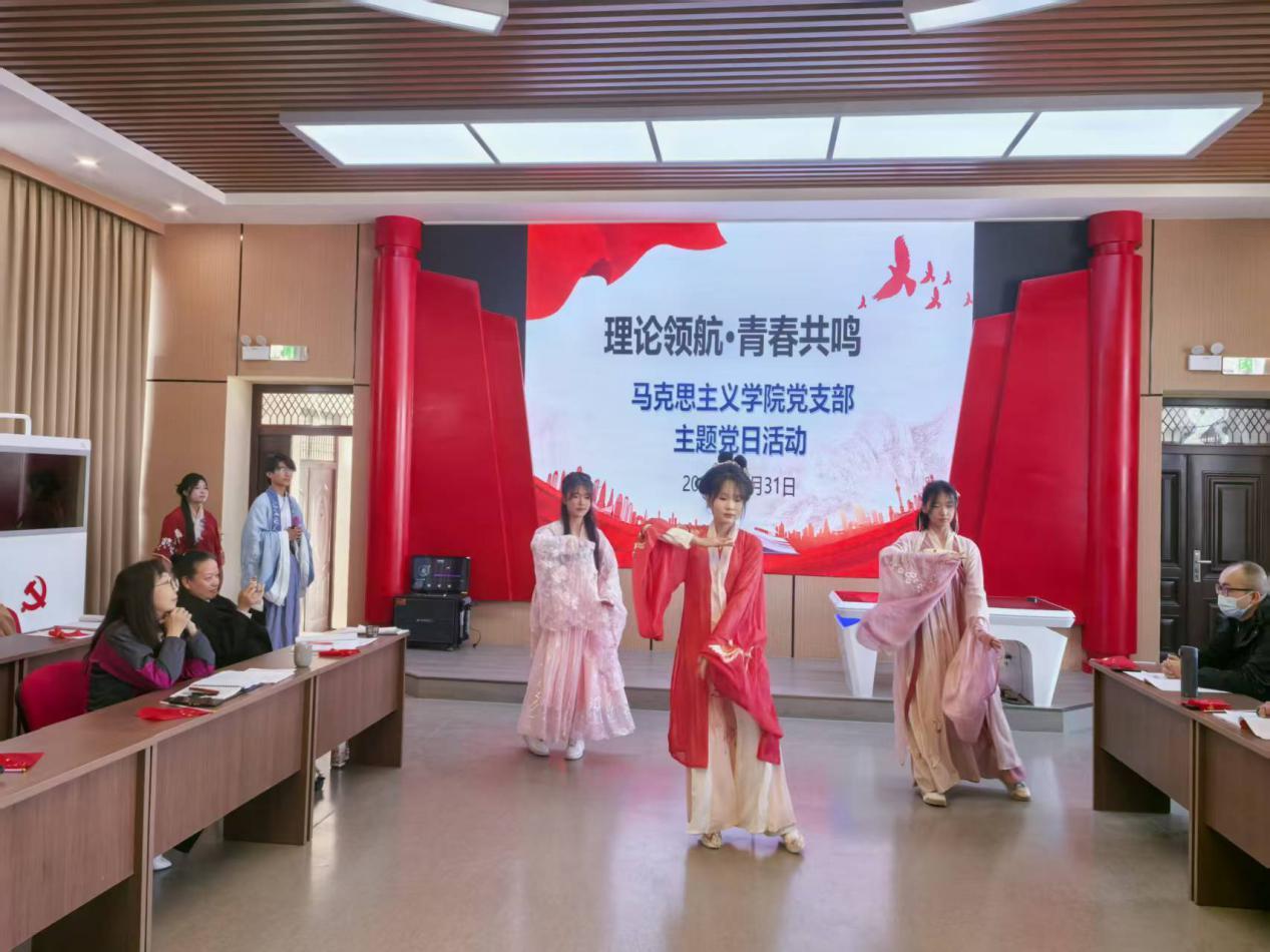 随后国风社的同学们带来了韵味十足的成果展示。经典舞蹈《蒹葭》与歌曲《青花瓷》接连上演,她们以优雅的舞姿与动人的歌声,将中华美学精神展现得淋漓尽致。这正是马克思主义学院在“党建带团建”工作中,着力引导青年以党的创新理论解读传统文化、推动“古韵今风”相融合的生动实践。