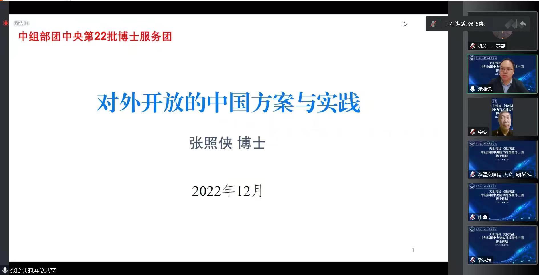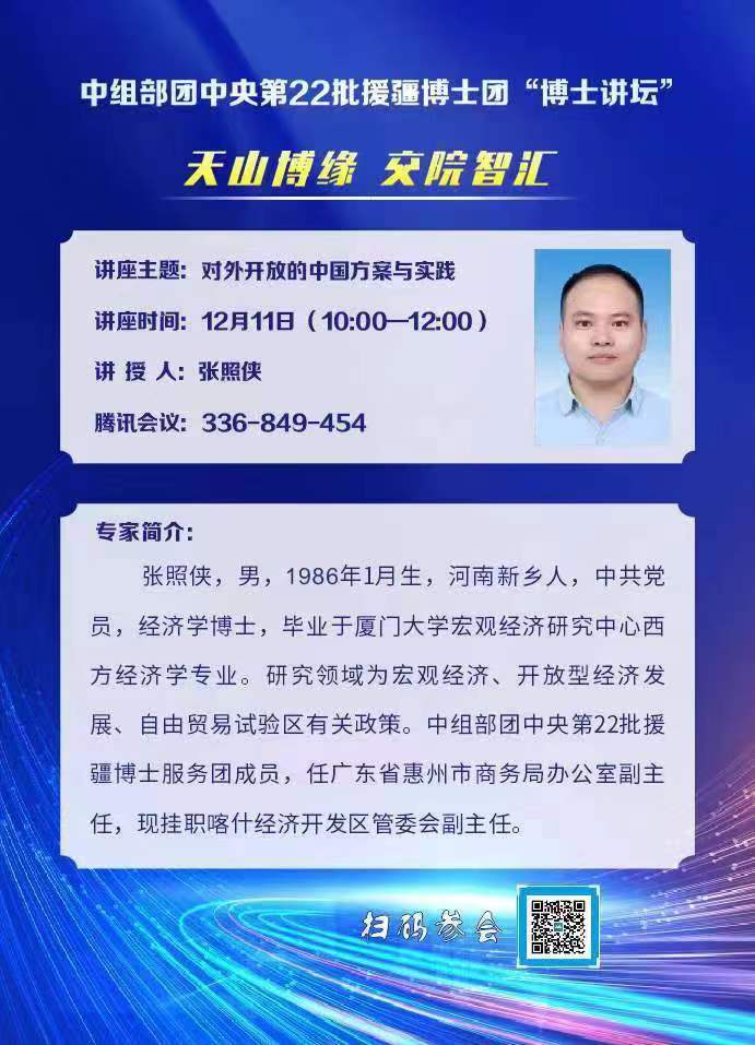 为深入学习贯彻党的二十大报告关于“坚持高水平对外开放,加快构建以国内大循环为主体、国内国际双循环相互促进的新发展格局”的要求,12月11日上午,第22批援疆博士团张照侠博士以“对外开放的中国方案与实践”为题,为学院师生带来了一场精彩的讲座。