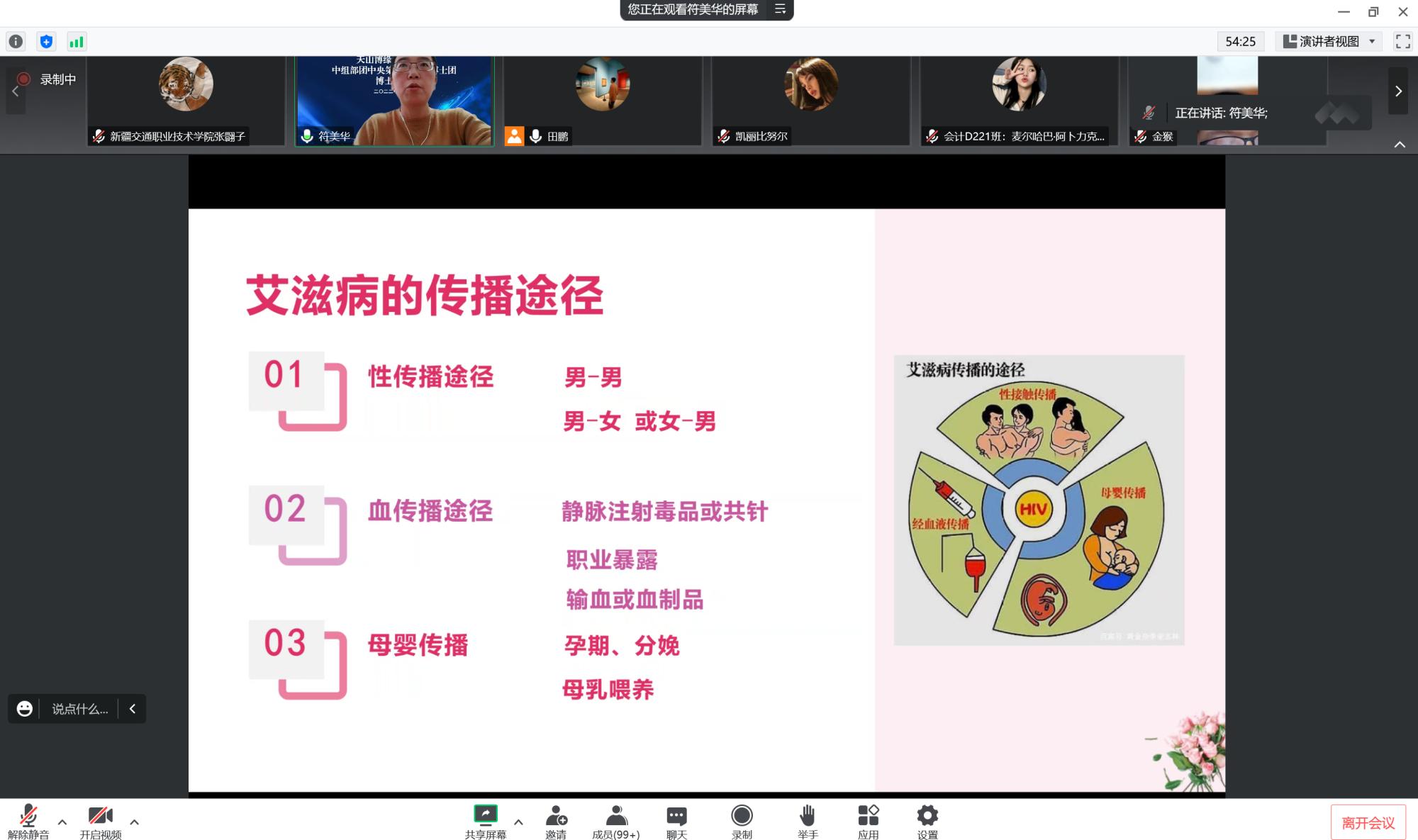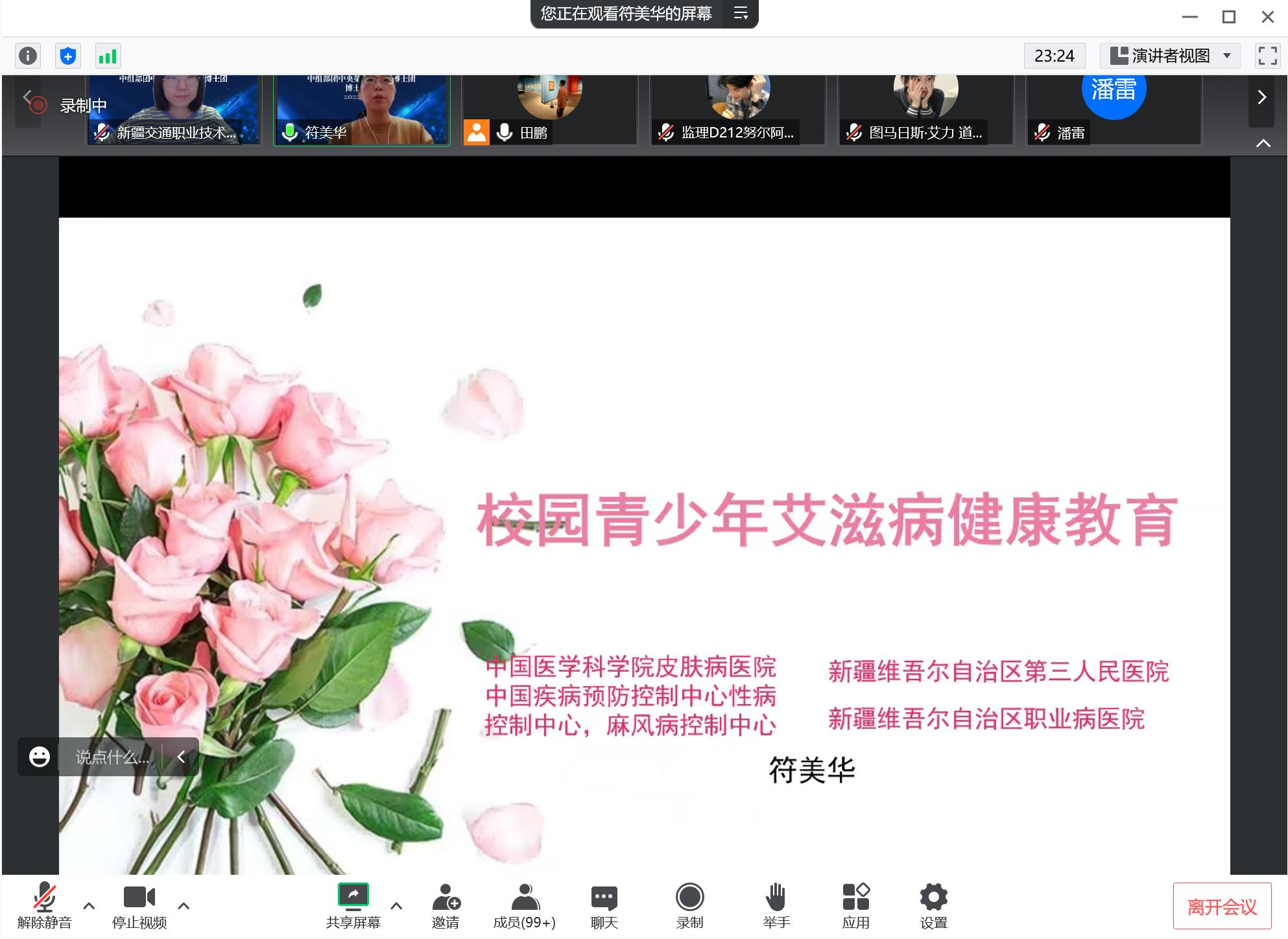为全面贯彻落实党的二十大精神及习近平总书记关于健康中国战略重要论述精神,进一步推动新时代艾滋病防治工作高质量发展,持续加强我院艾滋病科普宣传教育、普及艾滋病基本防治知识,12月24日上午,学院227名师生齐聚云端,共同聆听了第22批援疆博士团符美华博士题为《校园青少年的艾滋病健康教育》的专题讲座。
