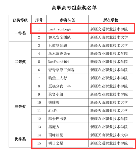 我院共派出6支参赛队18名选手参赛,经过1天的激烈角逐,我院人工智能工程学院fastjsonLog4j参赛队(指导老师:王玉洁,参赛队员:胡骏、孙涛、蒋仲鑫)荣获高职高专组一等奖;明日之星参赛队(指导老师:胡龙基,参赛队员:阿扎提古丽·亚森、米尔妮萨·艾力、沙依达·吐尔地)荣获高职高专组优秀奖。新疆交通职业技术学院荣获优秀组织奖,指导老师王玉洁喜获优秀指导老师奖。