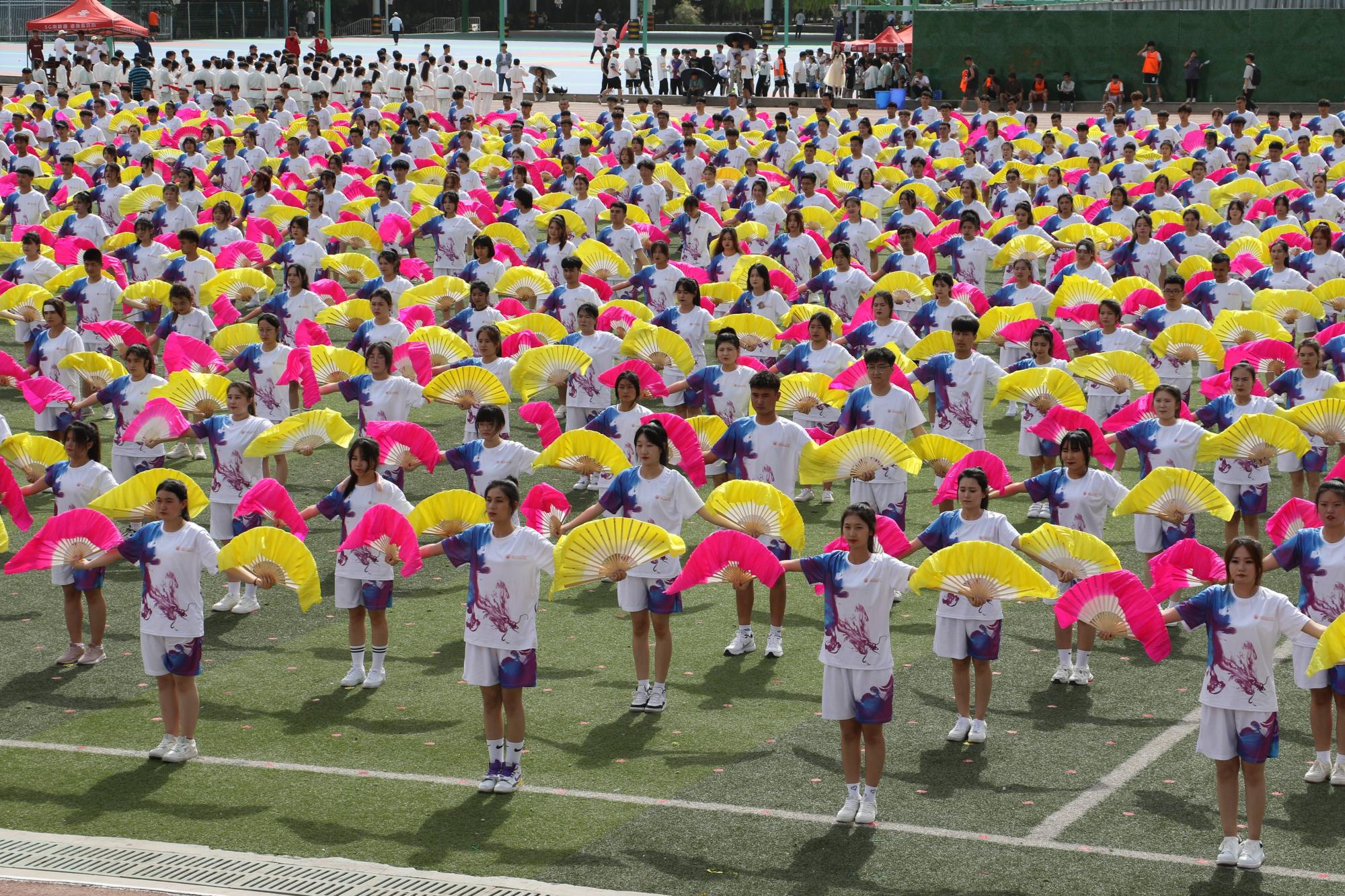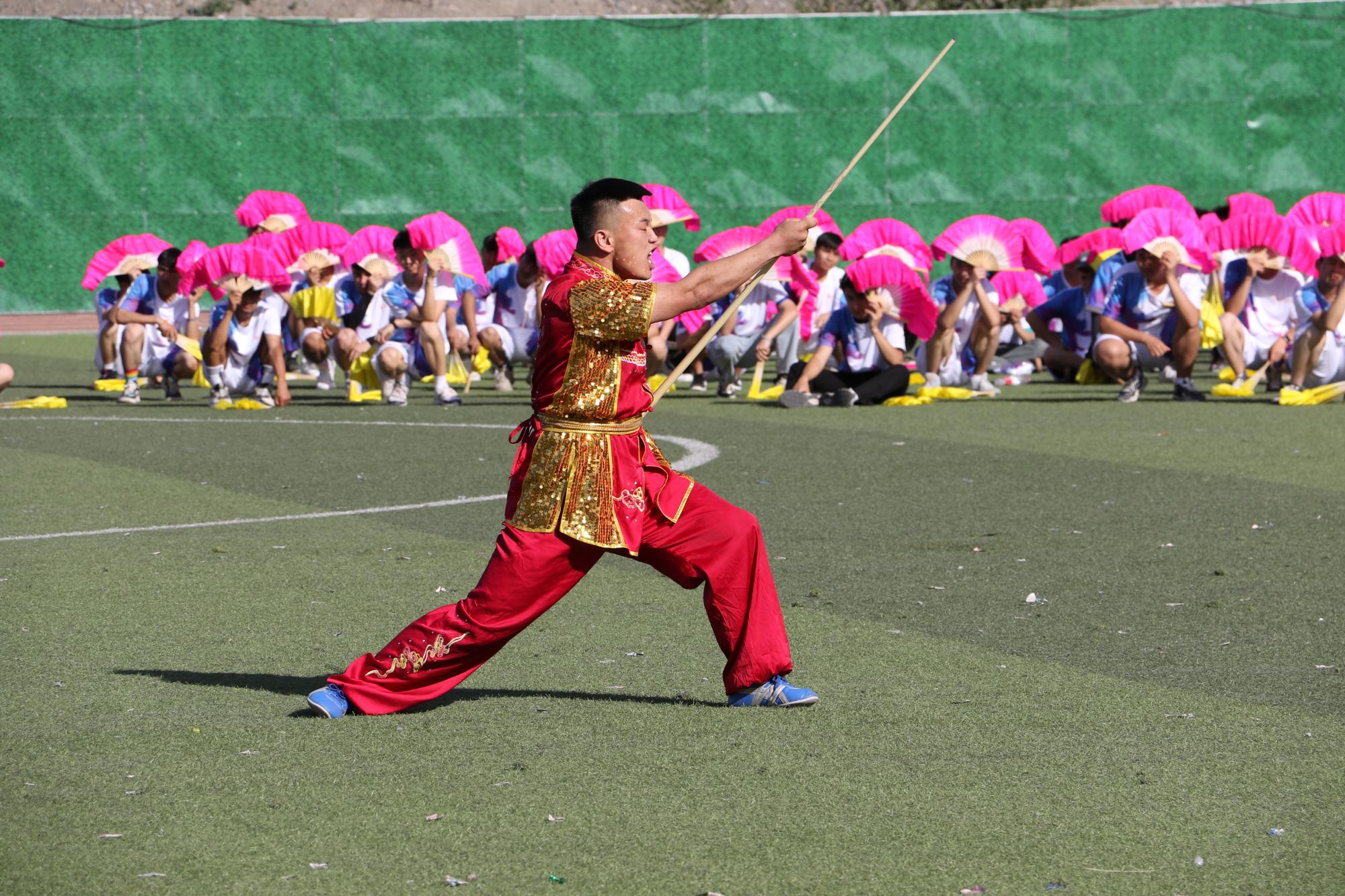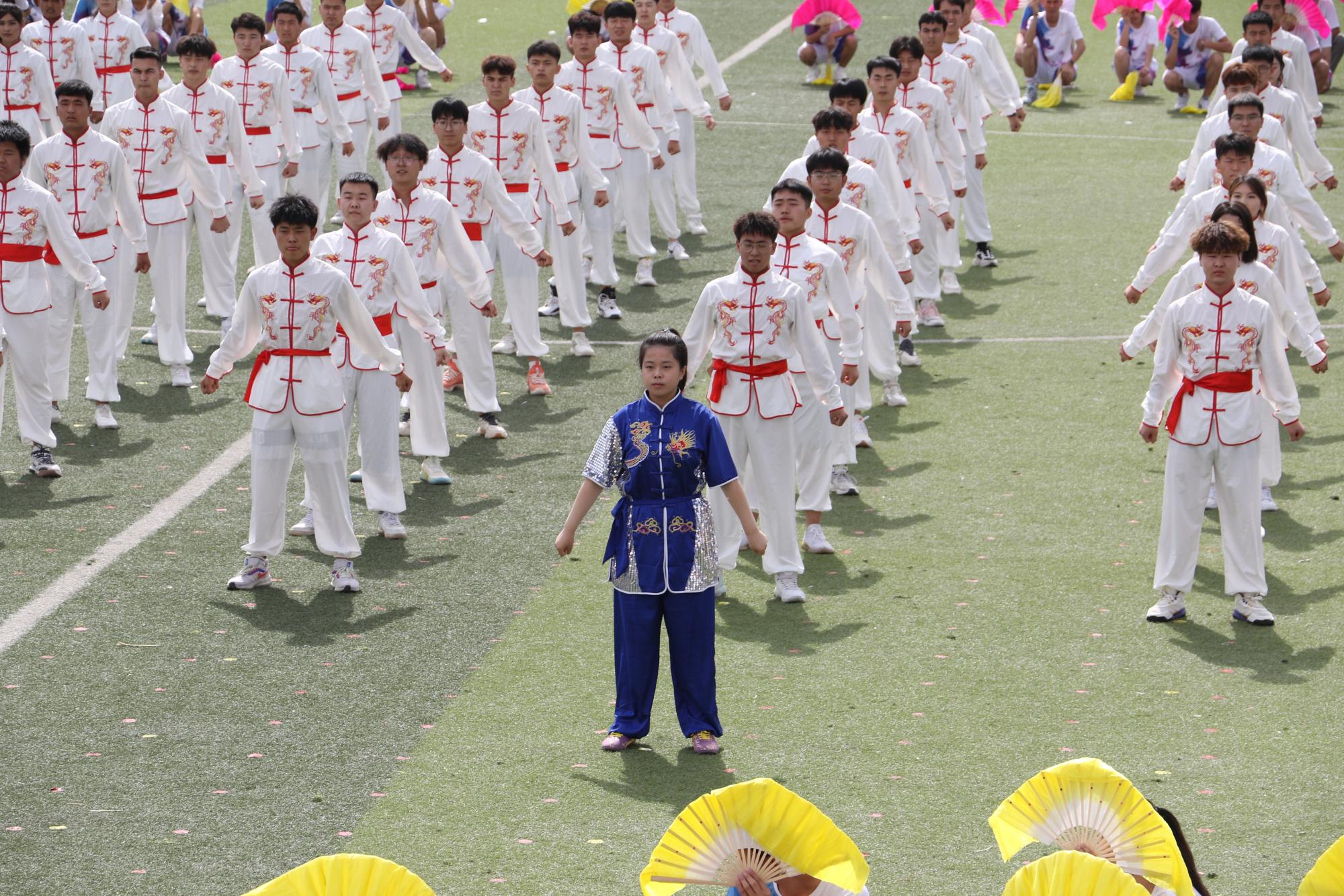 学院千人团体操将运动会气氛推向高潮,整齐划一、激情洋溢、花样繁多的扇子舞,威武刚猛的武术表演,1100名各族青年学子以天为幕,以地为台,伴着现场青春昂扬的音乐在“舞池”中尽兴起舞,展示了新疆交职院学子积极向上,青春活力的精神风貌。