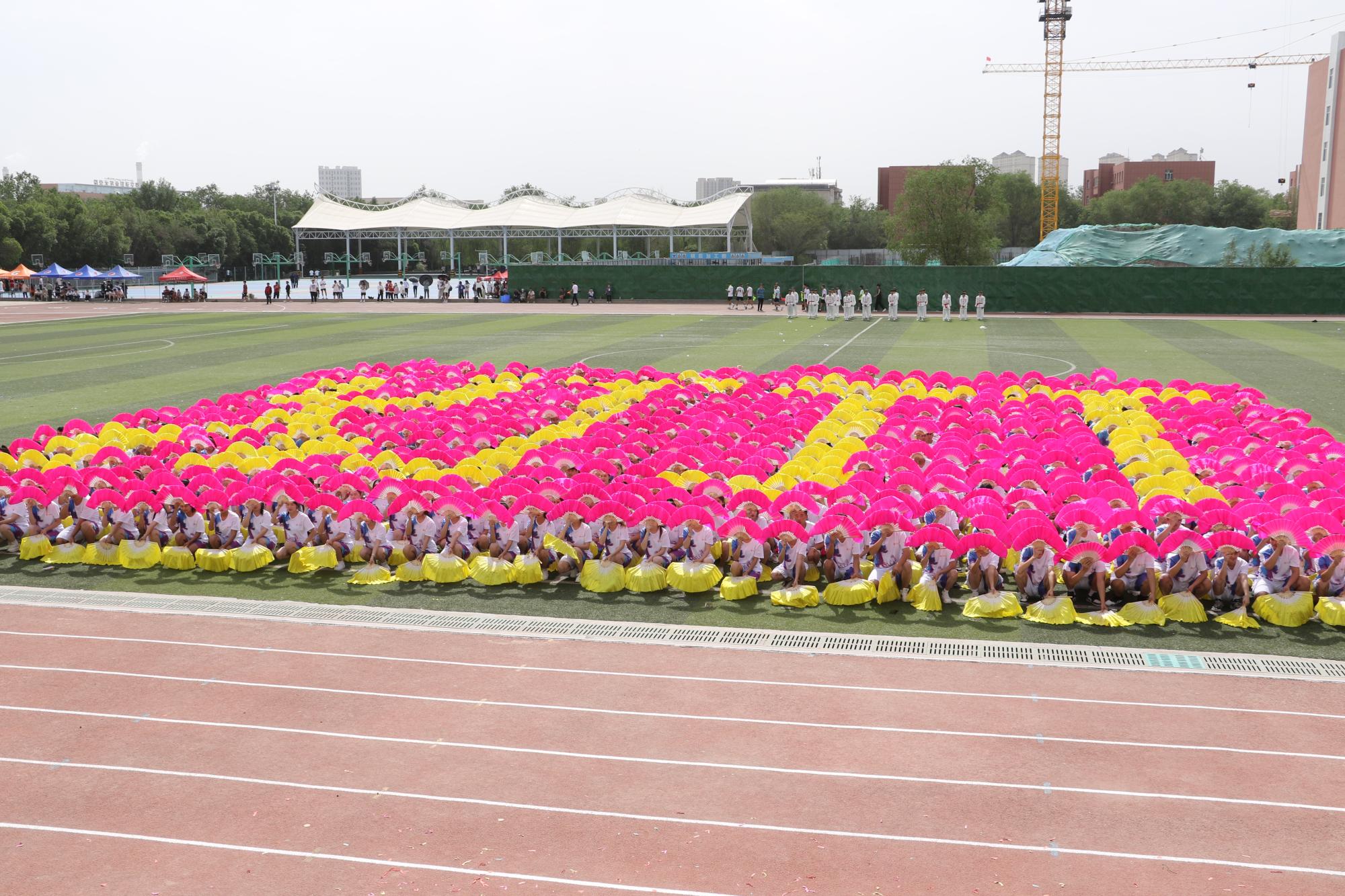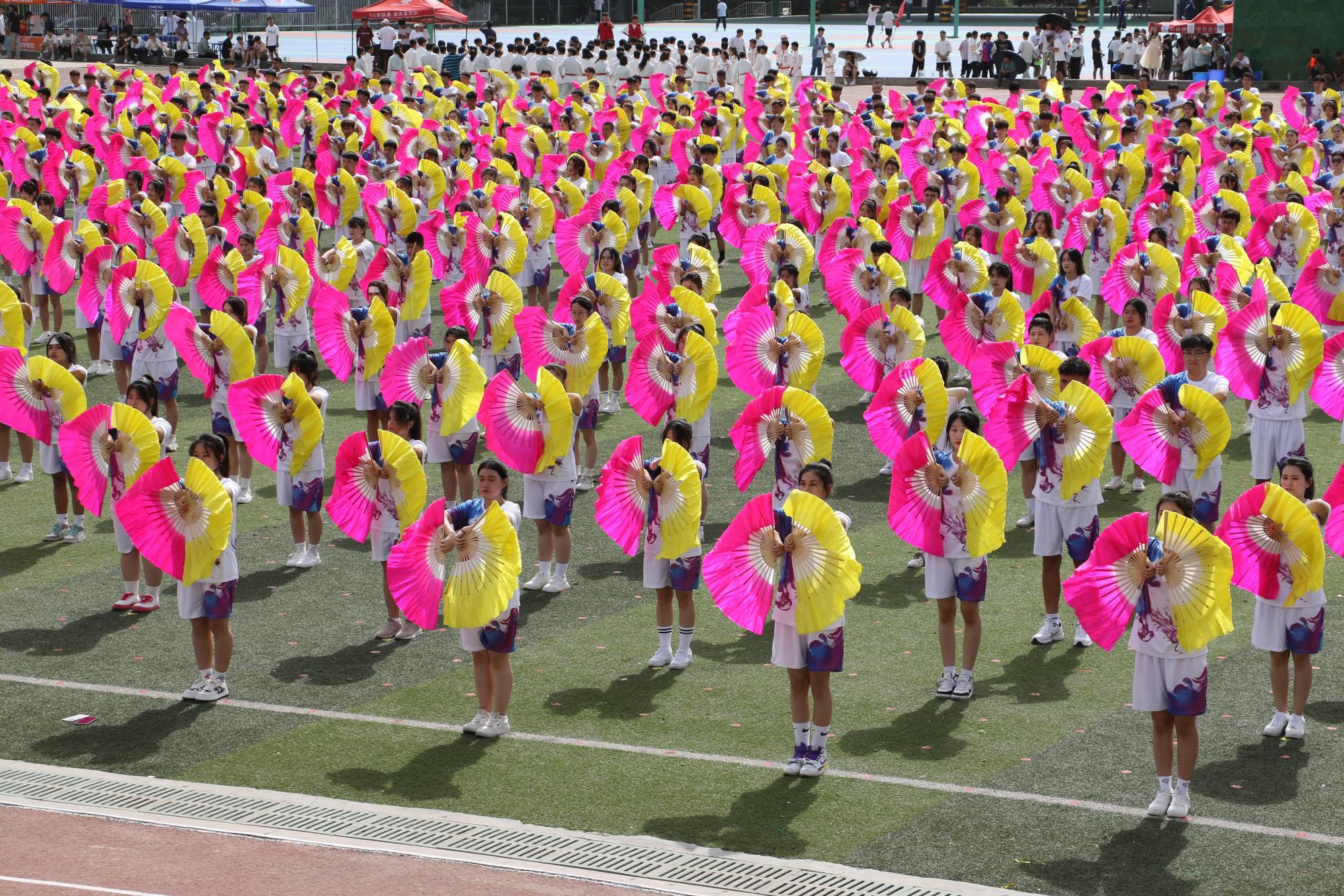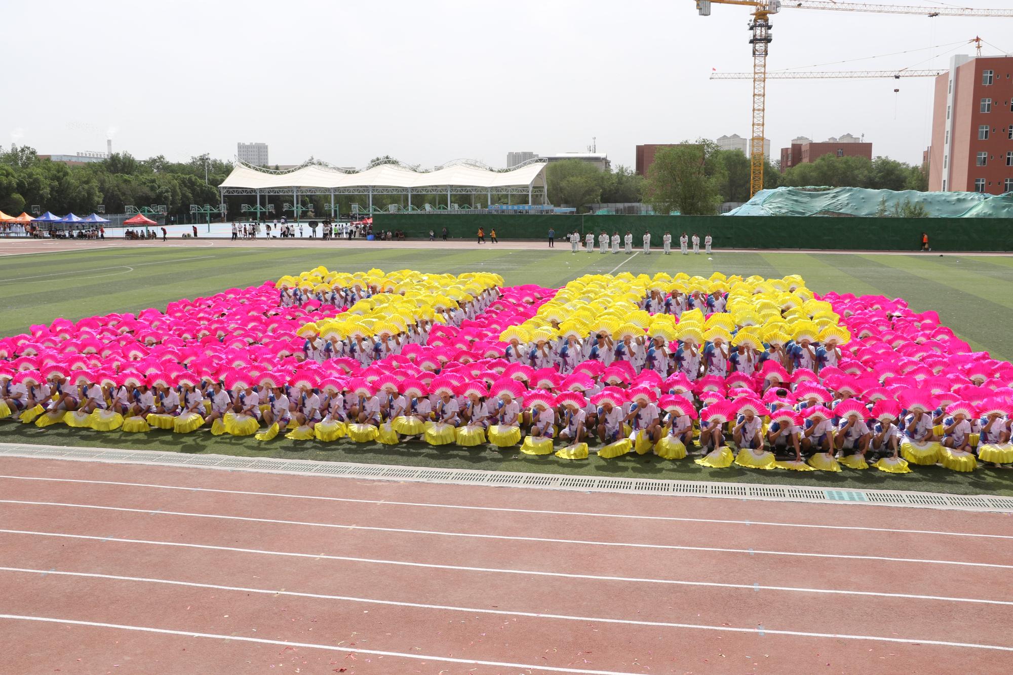 学院千人团体操将运动会气氛推向高潮,整齐划一、激情洋溢、花样繁多的扇子舞,威武刚猛的武术表演,1100名各族青年学子以天为幕,以地为台,伴着现场青春昂扬的音乐在“舞池”中尽兴起舞,展示了新疆交职院学子积极向上,青春活力的精神风貌。