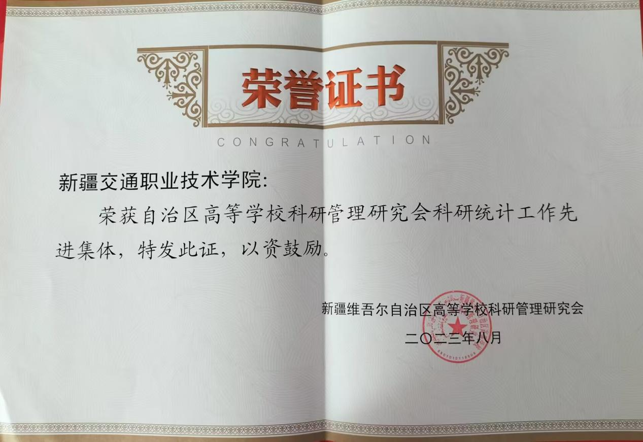 会议表彰了新疆大学、新疆交通职业技术学院等8个自治区高校科研统计工作先进集体,该荣誉是对学院科研统计工作的充分肯定和极大鼓舞。此项荣誉的获得离不开学院科研工作者的辛勤耕耘,也是学院各部门通力合作,共同努力的结果。