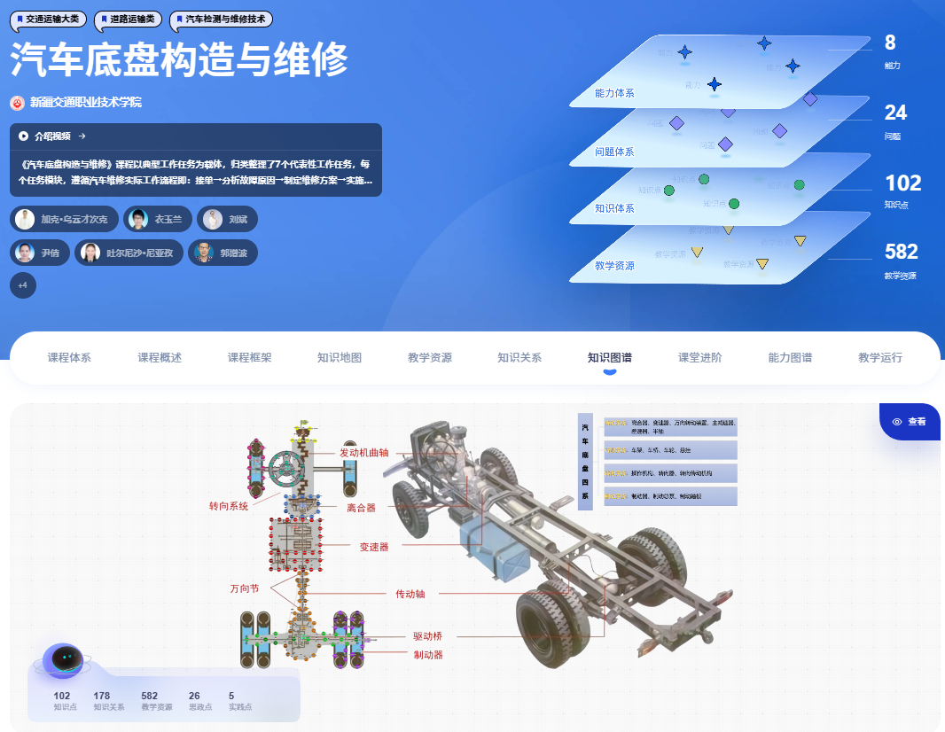 《汽车底盘构造与维修》是自治区首批精品在线开放课程,结合在线慕课建设的知识图谱,是根据真实的工作环境,系统化的教学设计,聚焦课程目标、知识框架、学习逻辑等关键要素,对专业知识进行细化拆解,结合线上线下混合式教学实施情况,共建成知识点102个、知识关系178个、教学资源582个、思政点26个、实践点5个,旨在促成学生职业能力的炼成,培养学生创新精神,提高学生实践能力,获得事半功倍的效果。