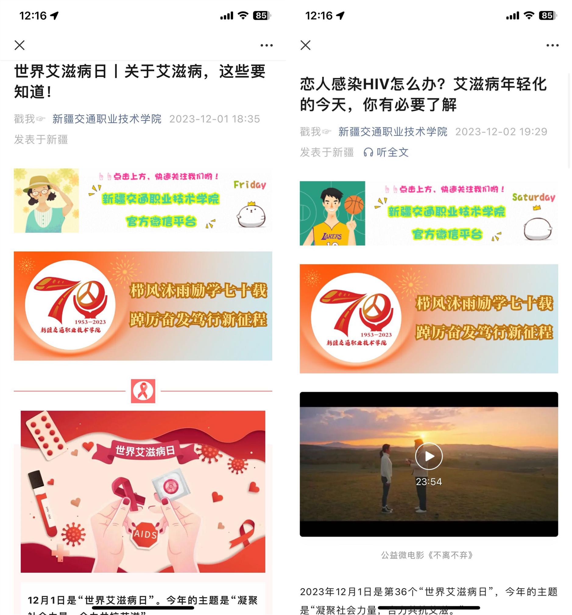 2023年12月1日是第36个“世界艾滋病日”。12月1日—20日,新疆交通职业技术学院开展了“凝聚社会力量,合力共抗艾滋”预防艾滋病系列活动。