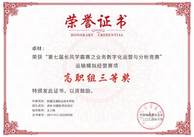 获奖选手阿合别尔激动地说:“很感谢学院给我们提供这样的平台,感谢王小艳老师全身心的带我们训练备赛,团队小伙伴也相互鼓励,一起努力拼搏。比赛中,我们通力合作,合理开拓市场,控制成本使得运营收益最大化,体现了我们现代物流、供应链领域的数字技能和专业实操能力。今后,我会更加努力学习,不断提升综合水平,为新疆现代物流业尽一份自己的力量!”