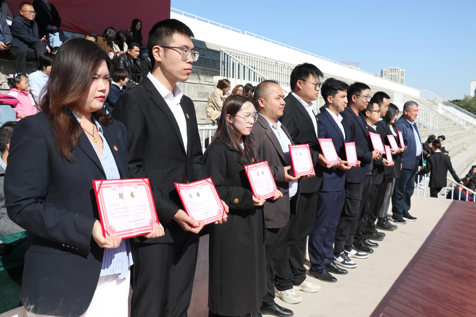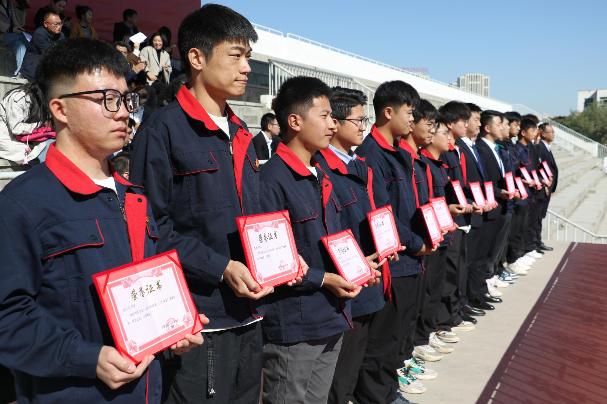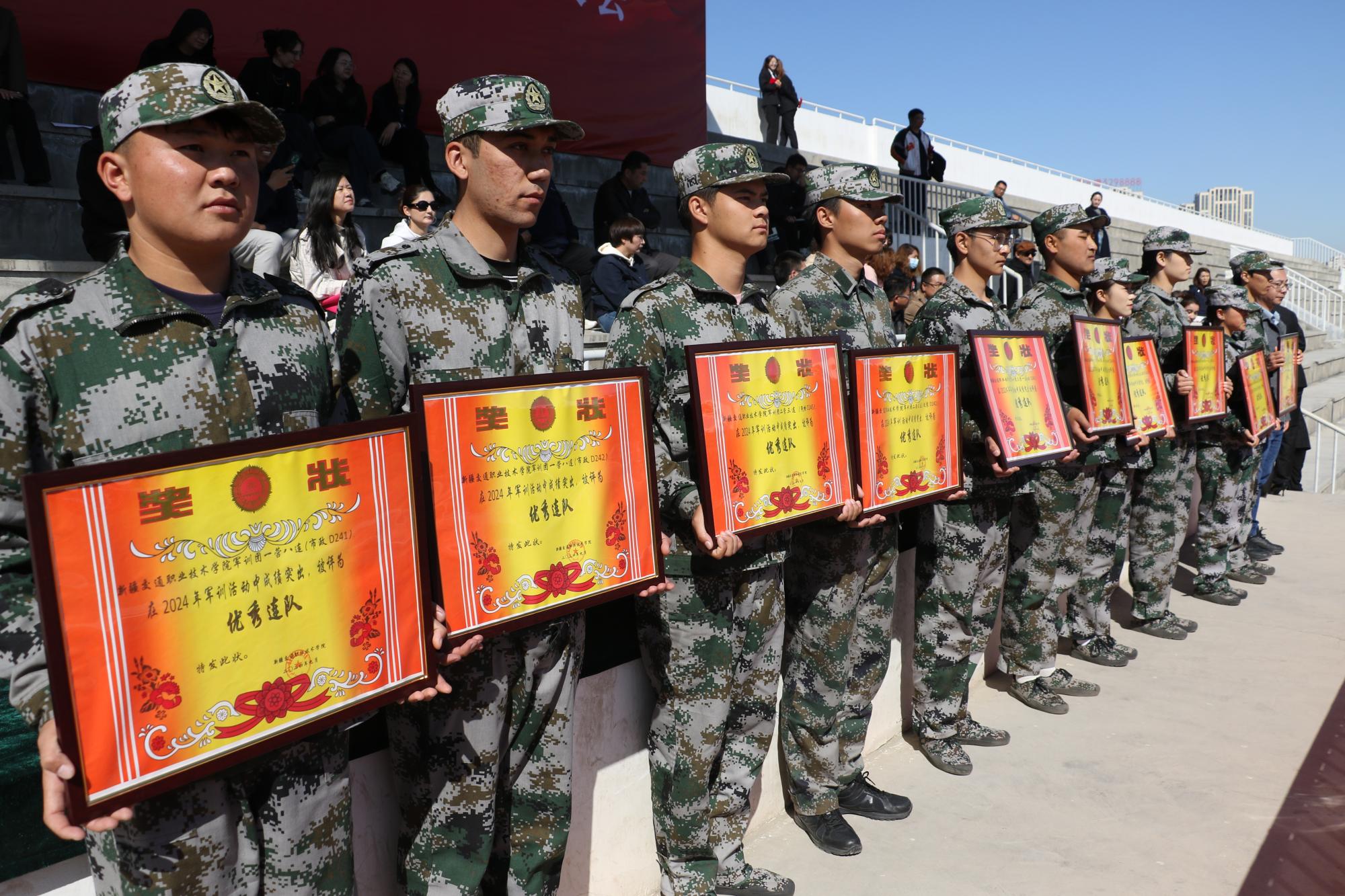 在总结会上,学院向武警新疆总队乌鲁木齐支队赠送了锦旗,并向军训优秀营、优秀连队、优秀教官代表、优秀标兵颁发荣誉证书。同时,学院为新聘任政治辅导员颁发聘书,并表彰了2023-2024学年“三好学生”“优秀班干部”。