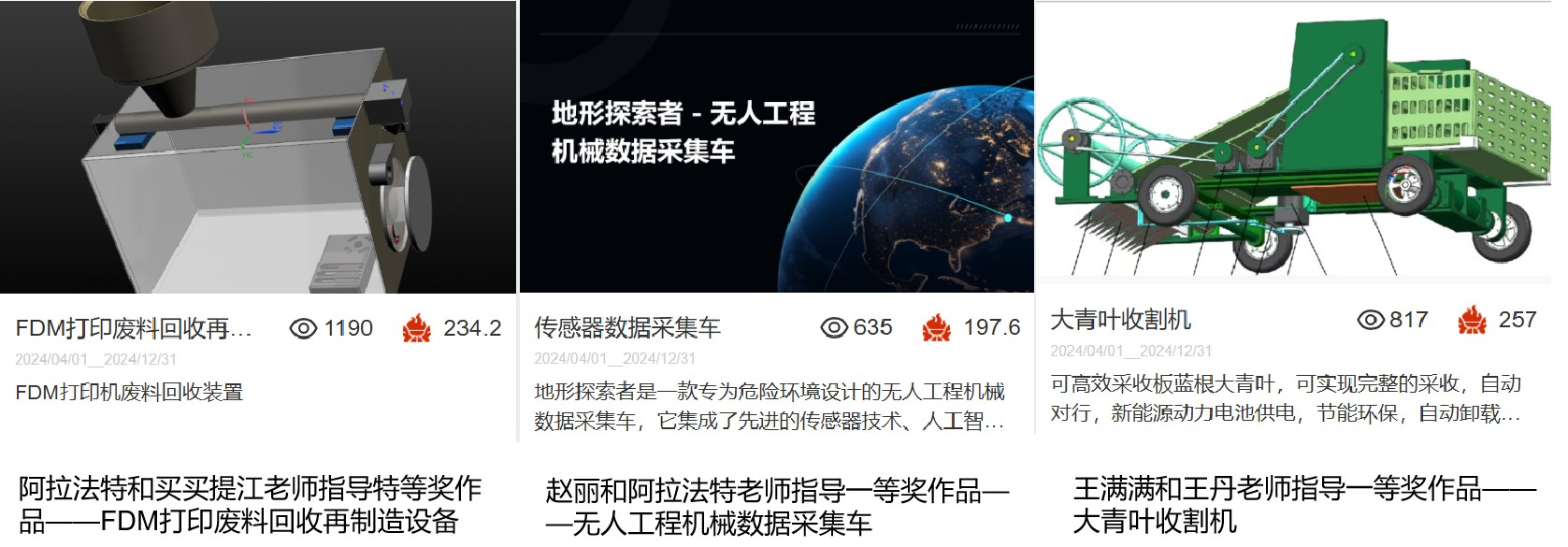 经过激烈角逐,我院参赛师生从众多参赛团队中脱颖而出,由阿拉法特·买尔旦、买买提江·马木提指导,谢秉锟、袁壮壮设计的《FDM打印废料回收再制造装置》荣获省级特等奖,并成功入围国赛;由阿拉法特·买尔旦、赵丽指导,何文强、努尔艾力·艾尔肯设计的《传感器数据采集车》荣获省级一等奖;由王满满、王丹指导,丁珍欢、李铭宇设计的《大青叶收割机》荣获省级一等奖。