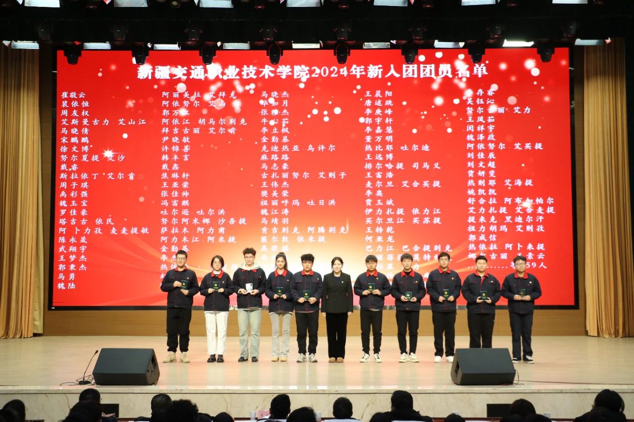 各分团委书记为新团员颁发团员证,随后新团员们面向团旗庄严宣誓。