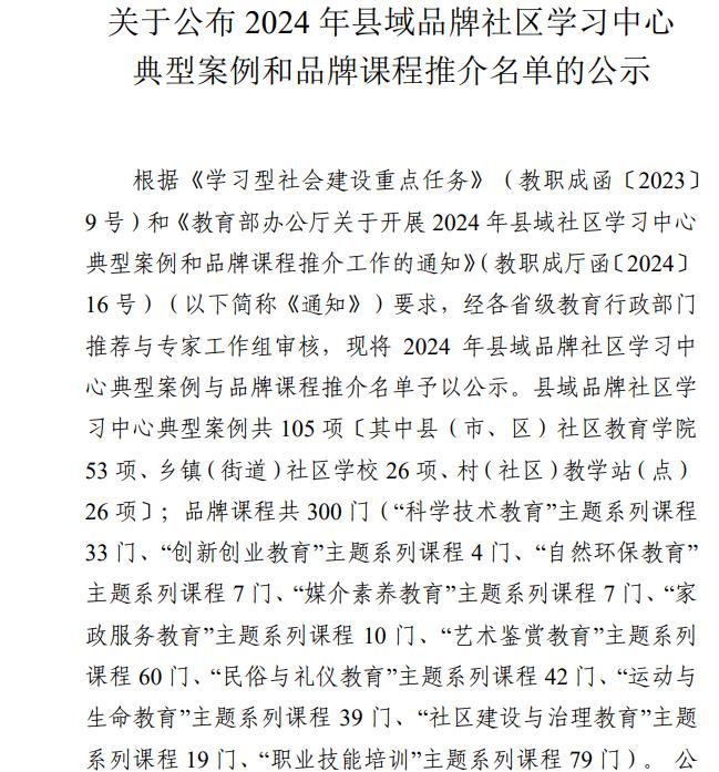 近日,学院终身教育工作再传捷报:在教育部公布的2024年县域品牌社区学习中心典型案例和品牌课程推介名单中,学院《英语语法点点通》《普通话必过宝典》2门课程榜上有名。