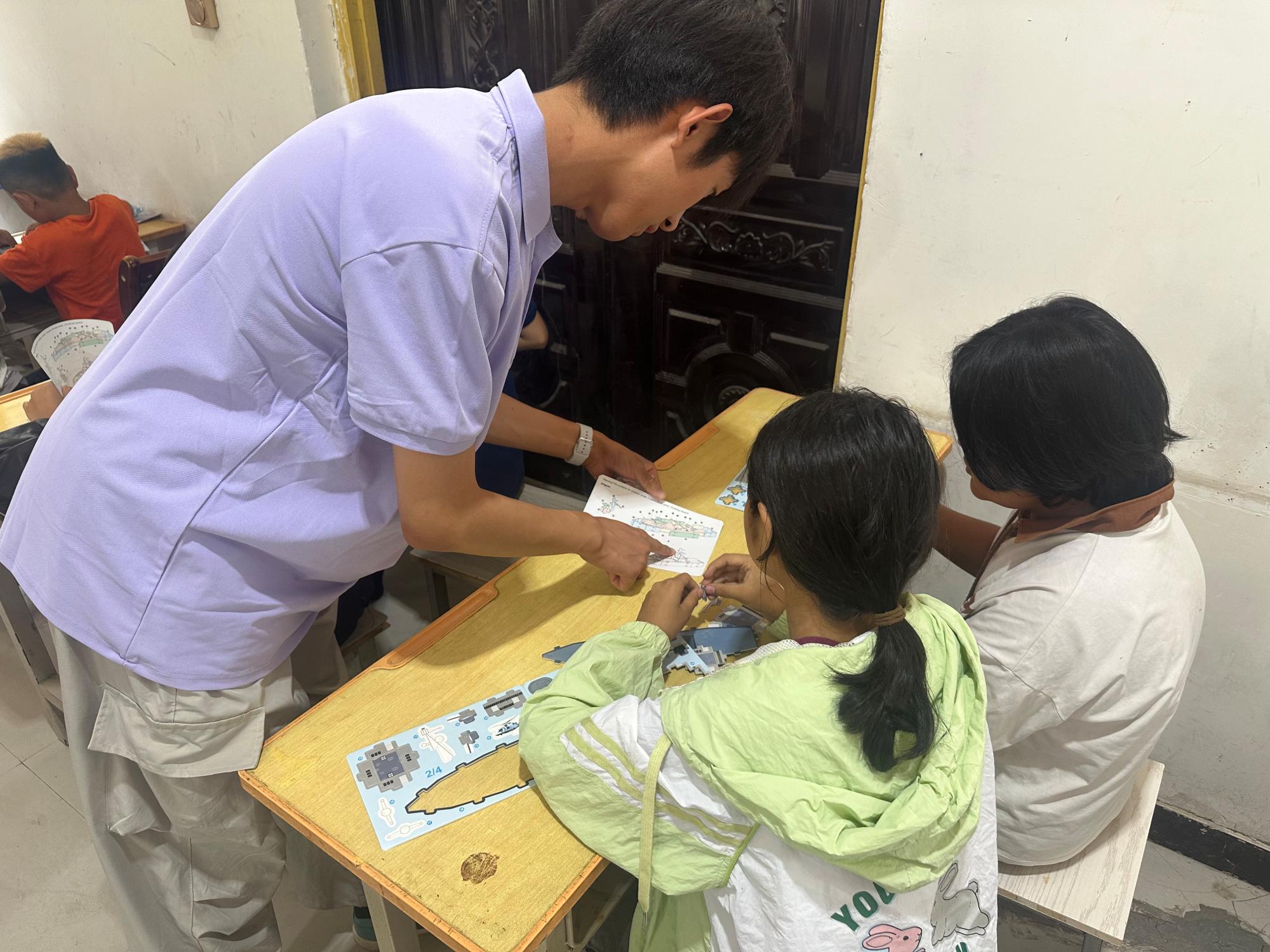 活动聚焦两个村子的小朋友,精心准备了普通话及海洋科普课程。在普通话教学中,江苏海事职业技术学院的志愿者借助有趣的儿歌、绕口令和互动游戏,鼓励孩子们大胆开口说普通话。“四是四,十是十,十四是十四,四十是四十”,志愿者带领孩子们反复朗读,稚嫩的声音在教室里清脆回荡。同时,对积极发言、发音标准的孩子赠送小奖品,极大激发了孩子们学习普通话的热情。海洋科普课堂上,江苏海事职业技术学院的志愿者通过高清图片与动态视频,生动展示了邮轮、货轮、渔船等各类海洋交通工具的外形特征与功能差异。“小朋友们看,这艘超级大邮轮就像一座移动的海上城堡,能装下几千名乘客呢!”志愿者用标准的普通话,将复杂的海洋知识转化为简单易懂、妙趣横生的讲解,孩子们听得全神贯注,不时发出阵阵惊叹,对神秘的海洋世界充满了好奇。同时还与孩子们共同制作帆船模型,当第一艘小船模型展现在大家面前时,整个教室响起热烈的掌声,孩子们捧着亲手制作的模型,脸上洋溢着自豪的笑容,眼中满是对未来的无限憧憬。