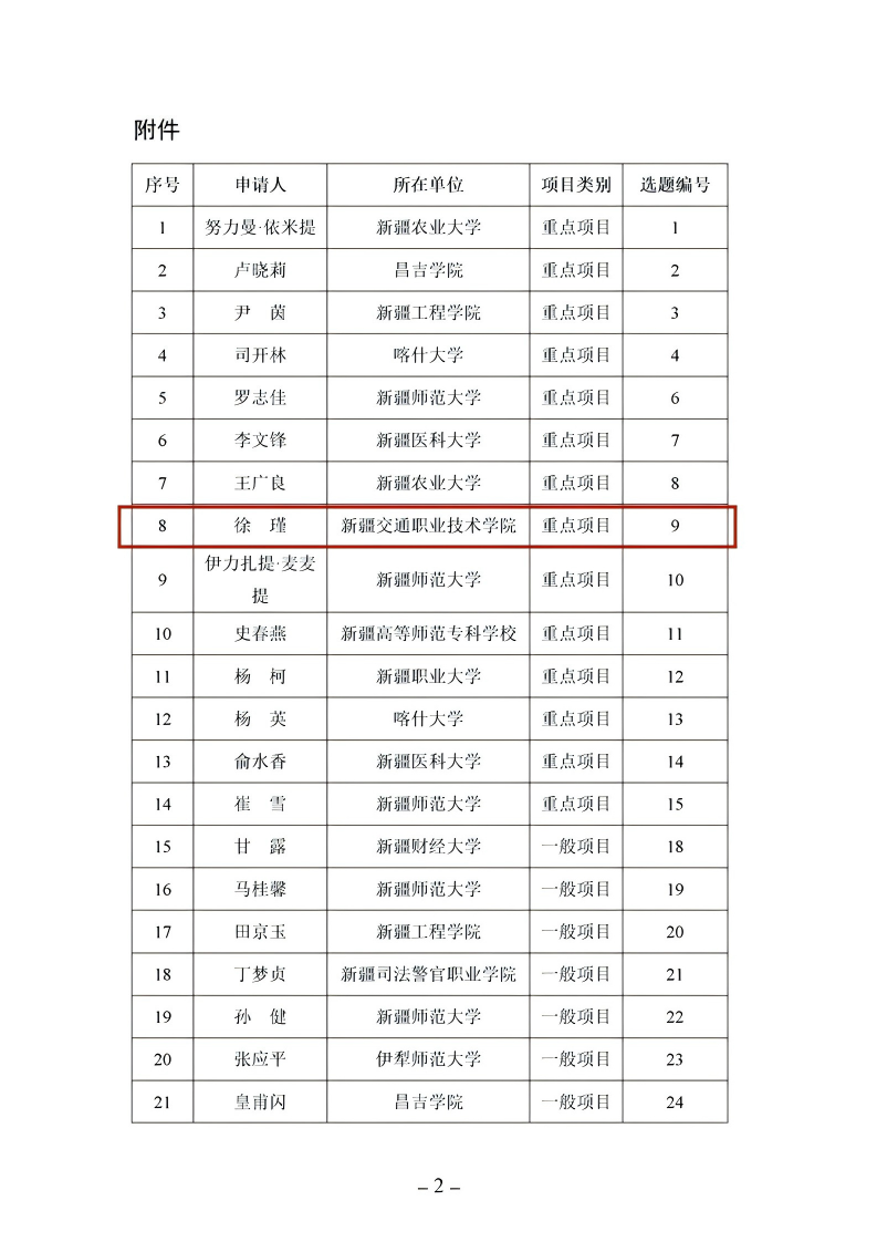 近日,自治区党委教育工委、自治区教育厅《2024年度新疆高校思想政治工作研究“揭榜挂帅”项目》评审结果公示,马克思主义学院副教授徐瑾主持的重点项目《新疆地方史有机融入中华民族共同体概论课教学研究》喜获立项。