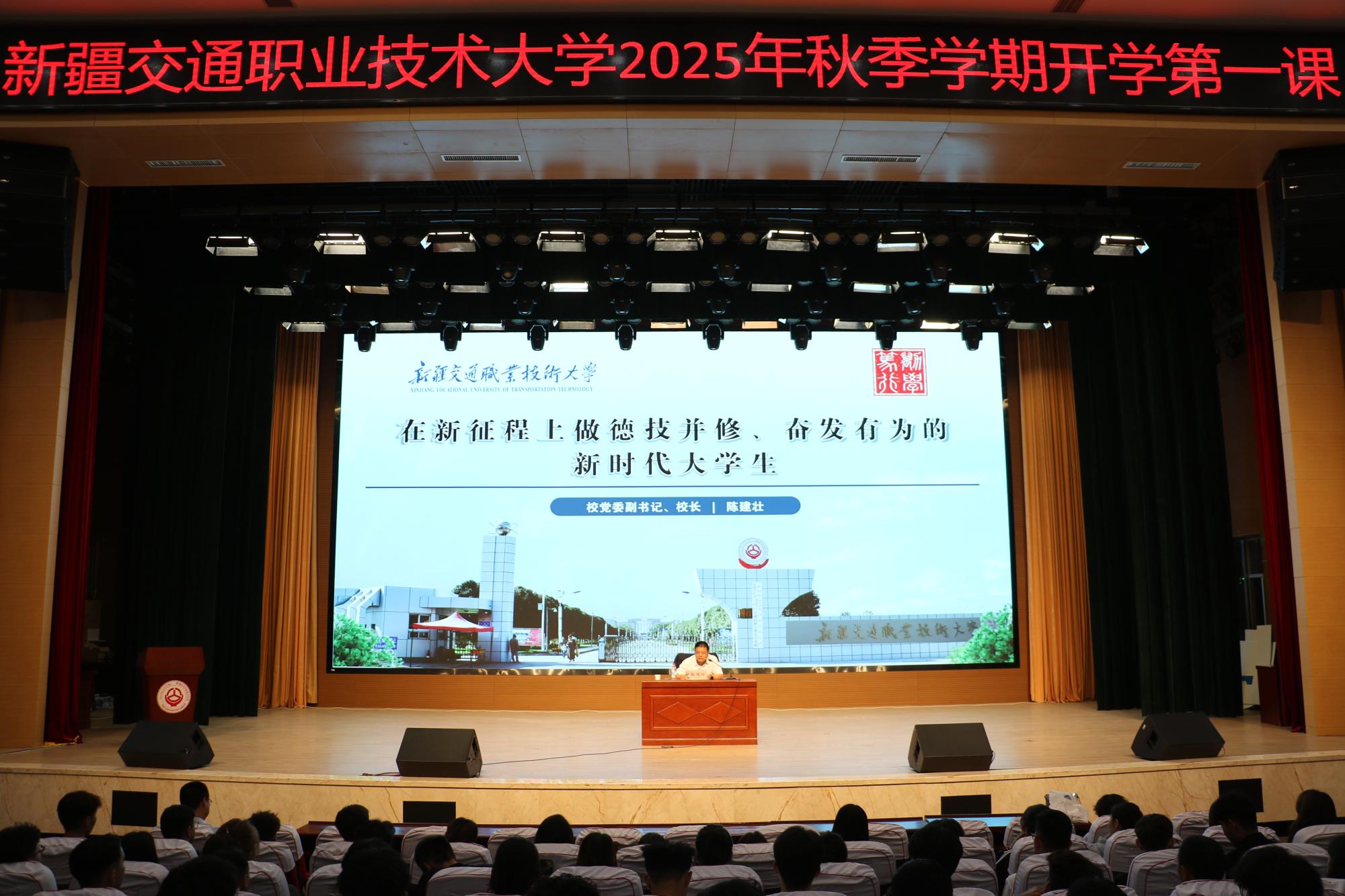 9月9日,BEAT365英国官网2025年秋季学期“开学第一课”在学校礼堂举行。校长陈建壮以“在新征程上做德技并修、奋发有为的新时代大学生”为题,为全体学生上了生动一课,勉励学生将个人理想融入国家交通事业发展,在天山脚下书写技能报国的青春华章。