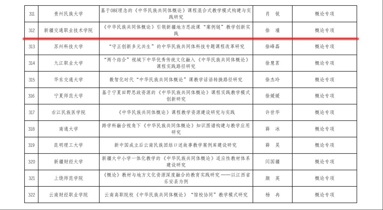10月22日,中华人民共和国国家民族事务委员会《2025年度国家民委高等教育教学改革研究项目》立项情况公示,马克思主义学院副教授徐瑾主持的“《中华民族共同体概论》引领新疆地方思政课‘案例链’教学创新实践”喜获立项。