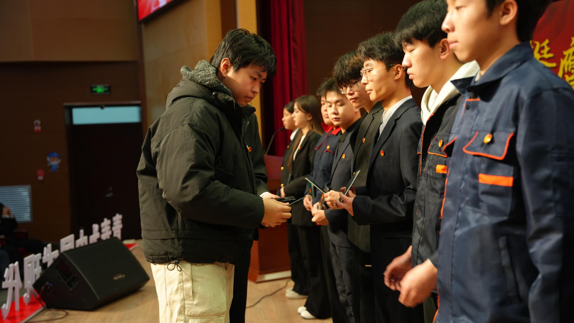仪式现场,校团委作2025年团员发展情况报告,全面梳理发展流程、总结工作成效。随后,团干部宣读新团员名单,组织全体新团员深入学习《团章》中关于团员义务与权利的核心条款,引导新团员深刻领会团员身份的责任与使命。优秀团员代表依次为新团员郑重佩戴团徽、颁发团员证并郑重宣誓,让每一位新团员真切感受到加入共青团的荣誉感与责任感。