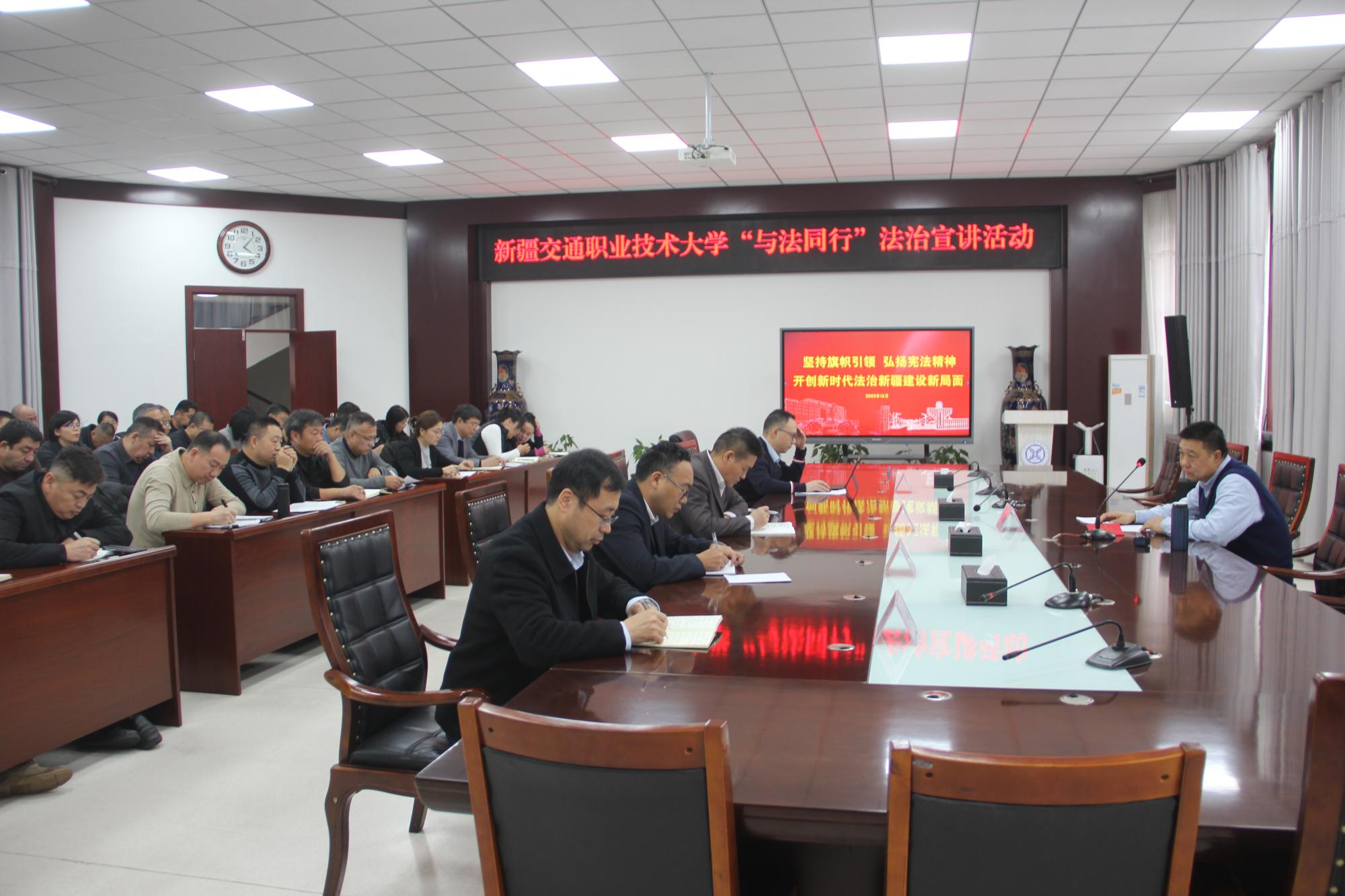 陈建壮强调,习近平法治思想是新时代全面依法治国的根本遵循和行动指南,其核心要义“十二个坚持”构建起逻辑严密、系统完备的科学理论体系,为新疆法治建设沿着正确方向前进提供了根本遵循;广大教职工要深入学习贯彻党的二十届四中全会关于法治建设的决策部署,把法治建设与学校中心工作深度融合,在推动高质量发展、维护国家安全、促进民族团结等关键领域,把法治建设的“规划图”精准转化为“施工图”;要着力提升法治素养与能力,夯实法治建设实践根基,强化党员干部带头示范作用,推动师生法治素养提升,为新疆社会稳定和长治久安筑牢坚实法治屏障。