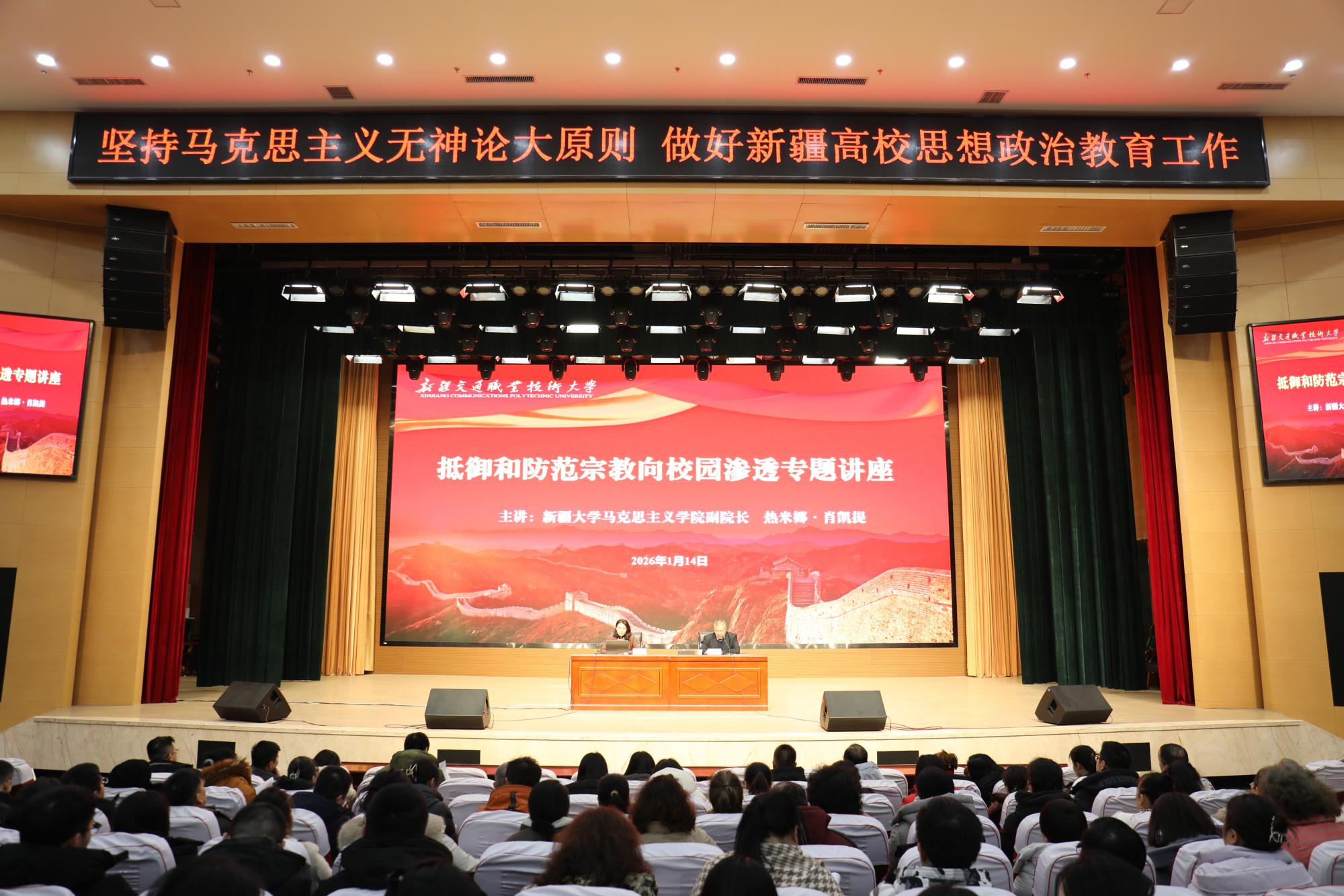 为深入学习贯彻习近平总书记关于民族工作、宗教工作、思想政治工作的重要论述,切实筑牢校园意识形态安全防线,1月14日,学校特邀新疆大学马克思主义学院副院长、宗教学博士热米娜·肖凯提教授开展马克思主义无神论教育专题讲座。校党委常委、统战部部长曹兴举主持活动。