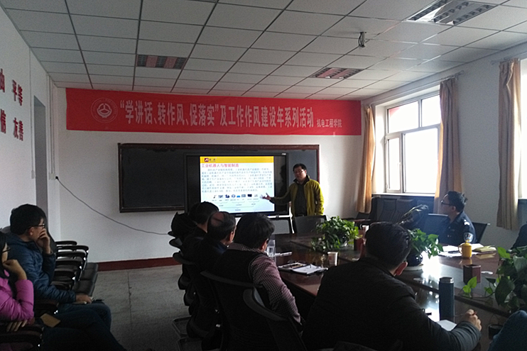 十九大报告指出,职业教育要深入推进产教融合、教学要推进知行合一,为落实党的十九大精神, 11月17日机电工程学院与亚龙教育装备集团联合开展了工业机器人讲座。机电工程党总支书记赛买提·艾力,副书记、副院长叶剑锋,亚龙教育装备集团工业机器人首席专家徐鑫奇和机电工程学院教职工参加讲座。机电工程学院副书记、副院长叶剑锋主持。