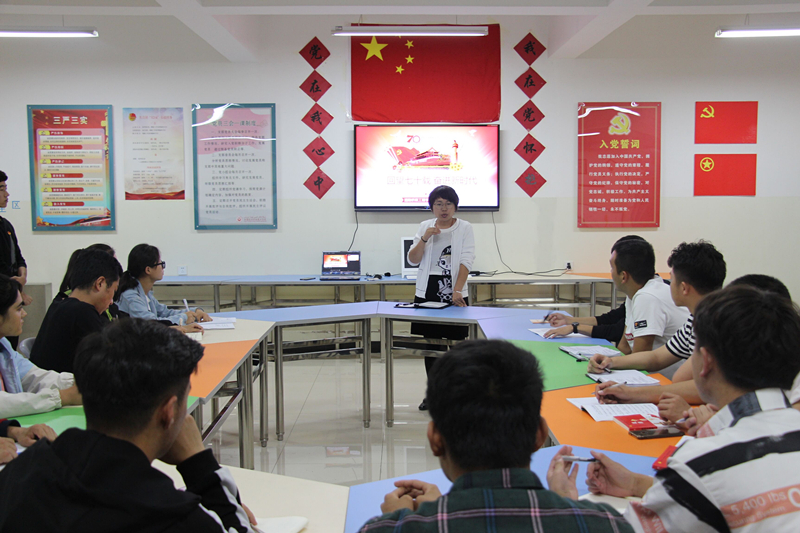 9月19日下午,道路桥梁工程学院学生党支部在十三号公寓党团活动室开展《回望七十载,奋进新时代》专题党课,学生党支部书记曹静同志主讲。