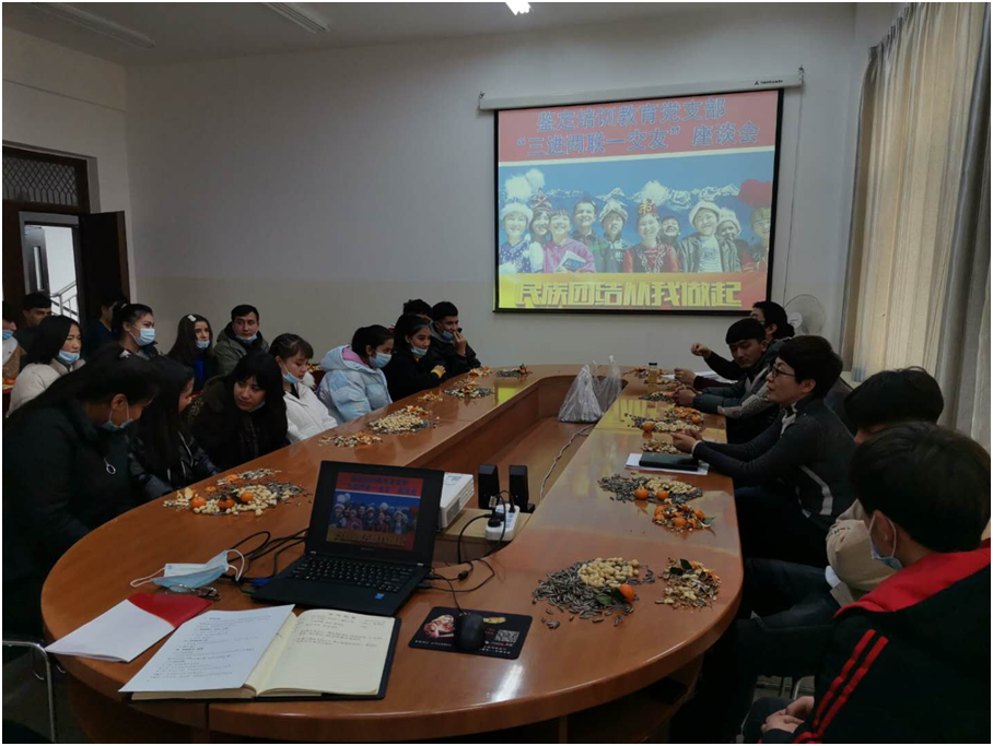 活动中,老师同学们相互交流,老师们认真倾听学生在校期间的学习生活情况,对学生提出的问题解疑答惑,同时认真记录学生生活学习中的实际困难。师生一同观看《我的中国心》《迪丽的烦恼》两部以爱国主义、民族团结为题材的微电影。观影后,结对子学生卜阿依谢姆同学说:“我们都是中华民族大家庭中的一员,各民族都应该互帮互助,团结友爱”。师生齐唱《歌唱祖国》让此次师生联谊活动达到了高潮。