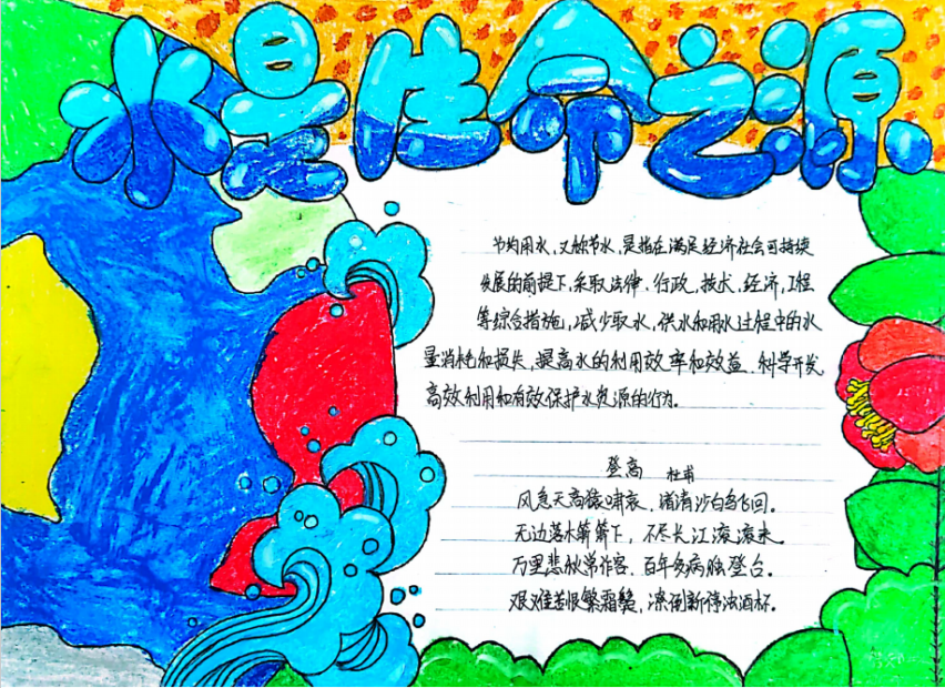 此次‘节水’系列活动通过开展主题团课、手抄报、绘画、小标语等形式在校园营造浓厚的节水氛围。活动一经开展,就得到了同学们的积极响应。同学们紧紧围绕节水小窍门、节水新理念、节水知识等内容开展创作,用图文并茂的方式绘制出丰富多彩的手抄报、绘画、小标语。一张张精美别致的节水手抄报、绘画,让同学们懂得了如何在生活中珍惜每一滴水。