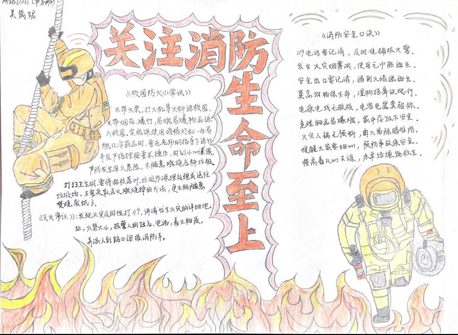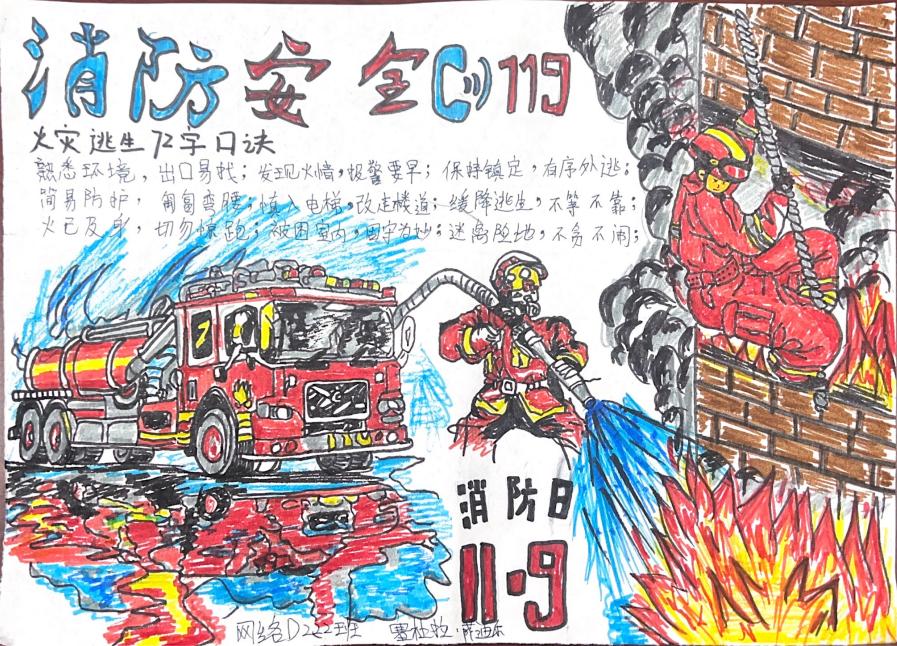 主题手抄报活动从前期宣传到报名,同学们表现得非常积极踊跃,共有56名同学参与其中。手抄报内容丰富、图文并茂、构思新颖,涵盖了消防安全知识、自护自救方法、防火警示标志、火警拨打119等,一句句朗朗上口的消防宣传标语、一幅幅生动形象的图文漫画,激起同学们对消防安全的重视。