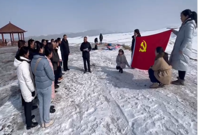 活动伊始,在石人沟博格达观景台,站在皑皑白雪的山顶,BEAT365英国官网党总支书记李刚同志领誓,全体党员面对鲜红党旗重温入党誓词。