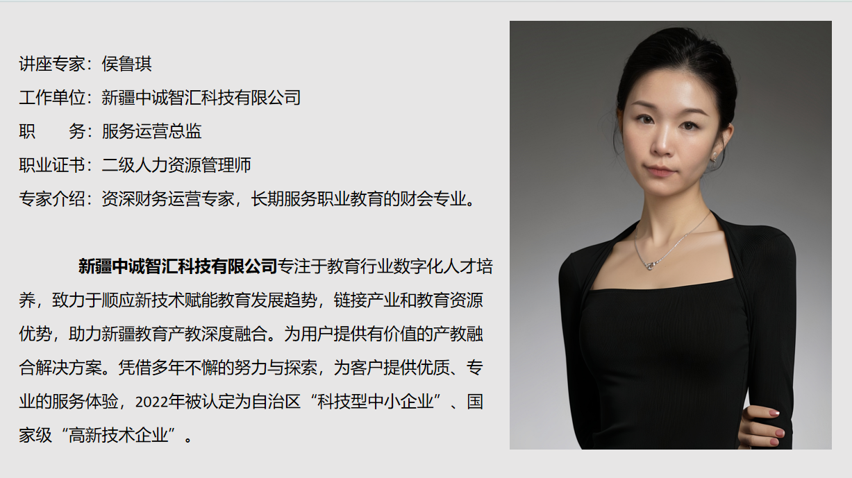 4月24日下午,运输管理学院成功举办财务数字化专题讲座。本次讲座邀请新疆中诚智汇科技有限公司侯鲁琪经理主讲,由大数据与会计专业负责人彭逸贤主持。