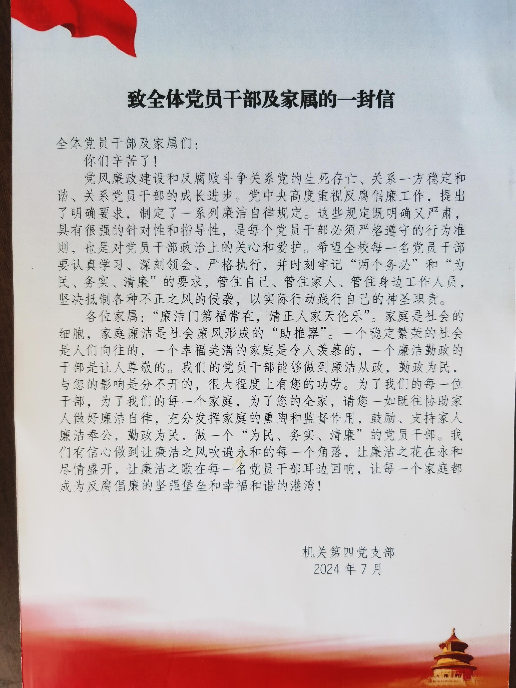 为庆祝中国共产党成立103周年,持续推进党纪学习教育,进一步弘扬伟大建党精神,引领党员干部立足岗位奉献担当,7月8日,机关第四党支部举行“强化警示教育 严守纪律规矩”主题党日活动,支部全体党员干部参加活动。