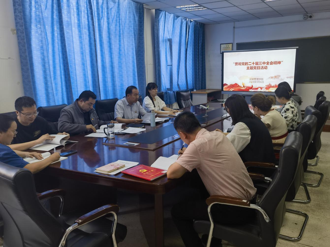 9月6日下午,运输管理学院在三号楼二楼会议室开展了“学习贯彻党的二十届三中全会精神”主题党日活动,全体党员参加了此次活动,运输管理学院党总支书记张军主持活动。