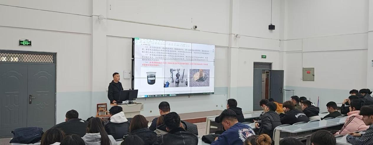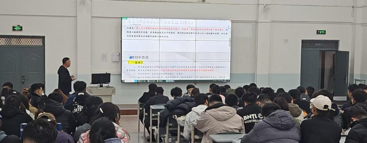 讲座中,冯立群教授从《交通强国建设纲要》、《二十多年来公路沥青路面施工技术经验》等政策文件引入,围绕新疆沥青路面施工质量管理和控制技术手册中关于路面所用材料性能要求、基层和底基层的实施等内容进行了详细讲解。结合新疆寒旱荒漠环境条件特点,冯立群教授重点介绍了现行沥青路面的施工技术、新材料和新结构的应用及原材料质量控制的手段和方法等,并耐心解答师生提出的相关问题。同时,聚焦于路面质量控制指标的调整这一关键领域,提出相关专业人才培养的宝贵意见和建议,深入剖析了其在新疆公路养护工作中所蕴含的巨大潜力以及广阔前景。