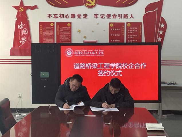 招聘会现场,道路桥梁工程学院领导及专业负责人还积极与多家企业负责人进行了深度沟通,围绕如何深化产学研合作、优化人才培养方案展开了深入探讨,并当场与新疆路育项目管理有限公司以及新疆广耀建设工程有限公司签订了校企合作协议,为后续人才培养与企业发展的协同共进奠定了良好基础。
