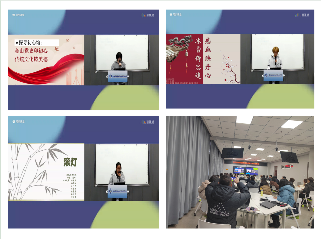 本次同步课堂以“思政课社会实践成果展示”为主题,由上海中侨职业技术大学李英平老师主持,两校教师代表及学生代表共同参与。课堂上,上海中侨职业技术大学各小组代表带来了精彩展示。第一小组围绕“金山党史印初心、传统文化铸美德”主题,深入挖掘地方红色资源,把党史学习教育和传统文化巧妙融合,让师生领略党史的同时感悟传统文化蕴含的美德与力量;第二小组以“热血映丹心、冰雪铸忠魂”为主题开展实践,通过为电影《长津湖》配音,生动再现那段波澜壮阔且英勇悲壮的历史场景,令在场师生深切体会到志愿军战士的热血与忠诚;第三小组则以短剧展现滚灯文化之美,凭借独特表演形式和深刻文化内涵,让传统技艺焕发新魅力。