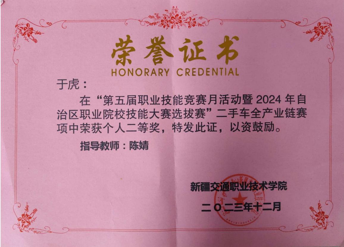 2024年获第五届职业技能竞赛月活动暨2024年自治区职业院校技能大赛选拔赛二手车全产业链赛项中个人二等奖