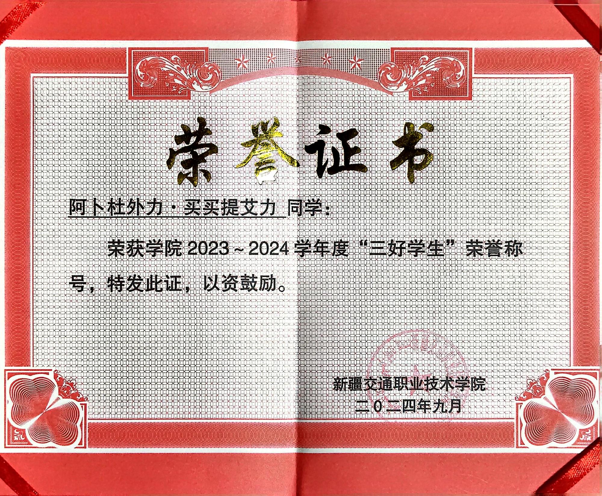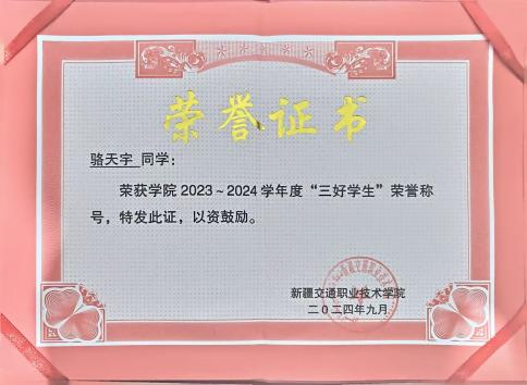 2024年获新疆交通职业技术学院“三好学生”荣誉称号