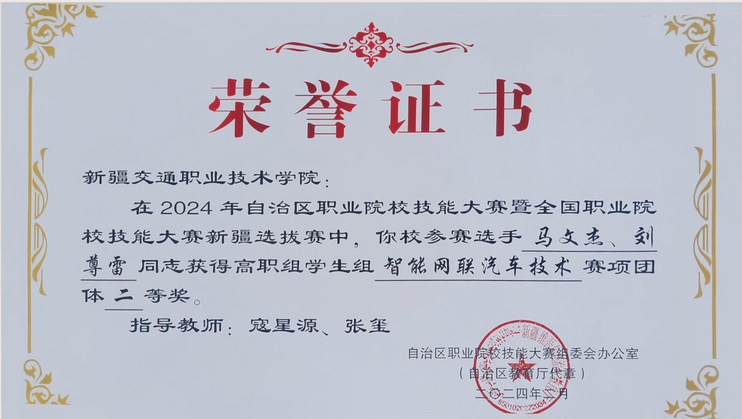 2024年获自治区职业院校技能大赛暨全国职业院校技能大赛新疆选拔赛中荣获智能网联汽车技术赛项团体二等奖