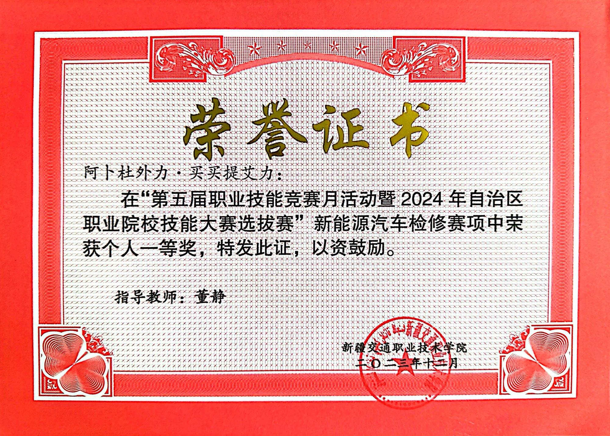 2024年获第五届职业技能竞赛月活动暨2024年自治区职业院校技能大赛选拔赛新能源汽车检修赛项中荣获个人一等奖