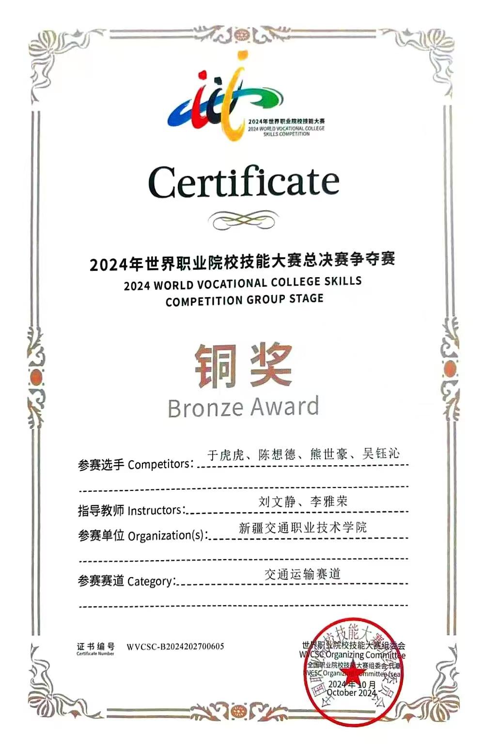 2024年获世界职业院校技能大赛总决赛交通运输赛道(汽车营销组)争夺赛铜奖