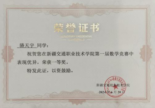 2024年获新疆交通职业技术学院数学竞赛一等奖