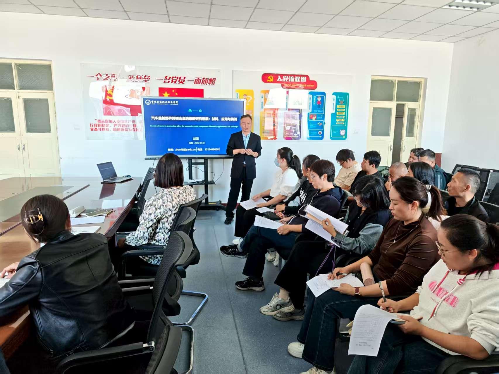 为深化教师对汽车轻量化材料及先进制造技术的理解,推动学院科研与教学水平的提升,9月22日下午,来自吉林交通职业技术学院的特邀援疆博士、正高级工程师战磊为BEAT365英国官网全体教师开展了题为《汽车座舱部件用镁合金的最新研究进展:材料、应用与挑战》的专题讲座。