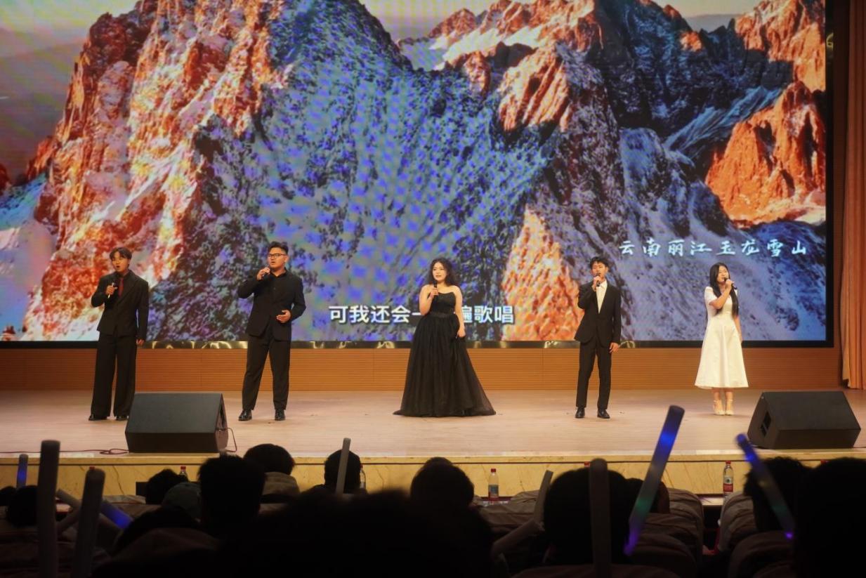 “青春奋斗”聚焦青年担当,《有我》以激昂曲调唱出新时代青年的使命与誓言;朗诵《青春筑路,逐梦天山》,用铿锵话语讲述天山脚下青年筑路的奋斗故事,诠释“精技报国”的学院精神;校艺术团的《街舞串烧》,以动感律动展现青春的热血与活力;《老男孩》,则用熟悉旋律唤起对梦想的执着坚守。“心怀感恩”篇章温情满满,《萱草花》以温柔歌声诠释“母亲花”的牵挂,传递对亲情的感恩;《时间都去哪了》则用真挚嗓音唤起对父母辛劳的体谅,引发全场情感共鸣。