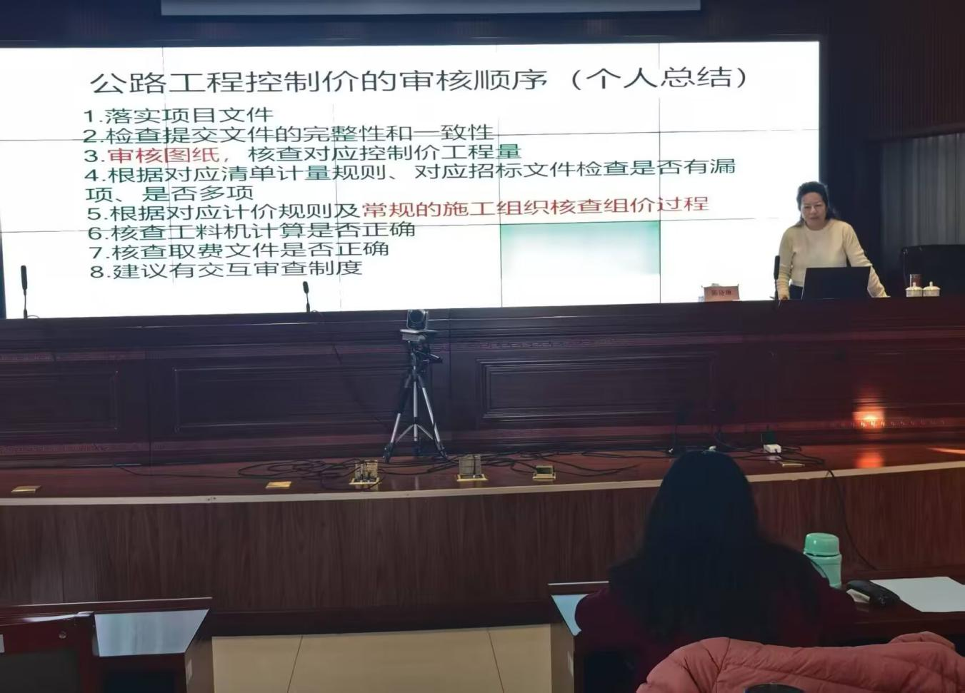 讲座中,陈诗琳结合自身专业研究与实践经验,系统剖析了公路与土建工程造价在主管规范、定额标准、计价逻辑等方面的异同,并通过实际案例拆解公路控制价审核的工程量核对、单价校验、取费规范等核心要点。内容紧密贴合阿勒泰地区相关工作实际需求,既有专业理论高度,又具实践指导价值,有效帮助参训人员提升业务能力。