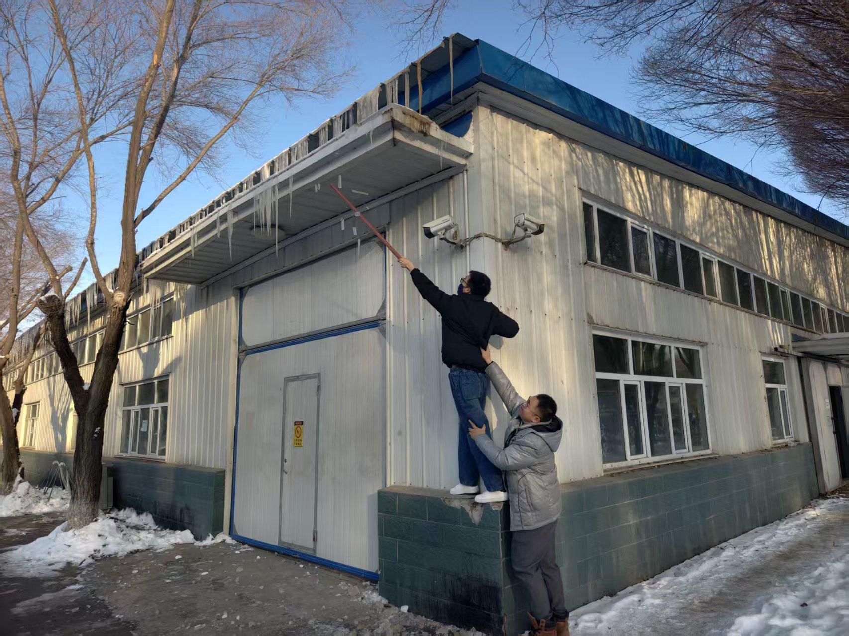 为应对冬季低温雨雪天气,保障师生出行安全,12月16日上午,运输管理学院组织实训中心教师,对物流实训楼、关务海事彩板房及周边区域开展冬季坠冰隐患清查专项行动。行动聚焦屋檐、房顶易形成冰棱部位及结冰湿滑路面,全面排查潜在风险,防患于未然。
