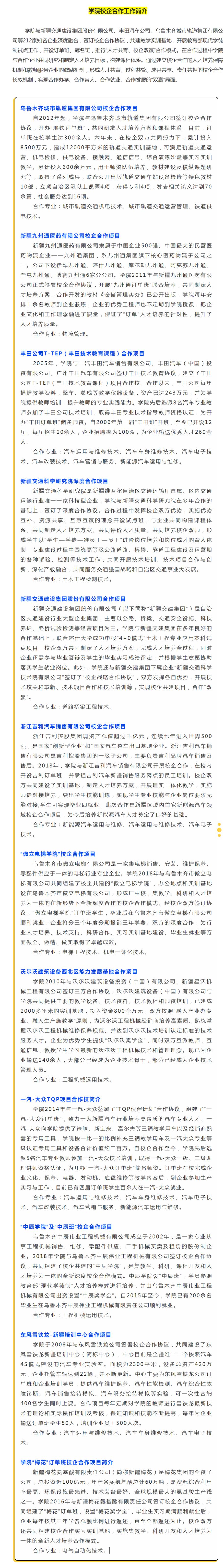 学院主动适应国家“一带一路”和新疆经济社会发展对人才的需求,突出综合交通运输行业特色,围绕着综合交通发展设有道路桥梁工程学院、BEAT365英国官网、机电工程学院、运输管理学院、人文基础教育学院、马克思主义学院、继续教育学院七个教学分院。开设有道路桥梁工程技术、汽车运用与维修技术、铁道工程技术、城市轨道交通运营管理、水路运输与海事管理、报关与国际货运等38个高职专业。现已建成自治区级特色专业9个、中央财政支持专业4个。学院积极推进校企合作、产教融合,依托道路桥梁工程、交通运输工程、机械电子工程、汽车运用工程四个研究中心积极为行业、企业提供技术服务,提升学院科研水平及服务社会能力。