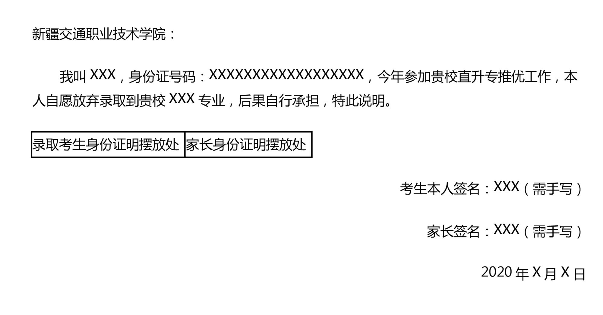 现将我院2020年直升专录取名单予以公示,公示时间为5月16日——5月22日,公示期间,考生可向我校申请自愿放弃录取,并提交相关材料,格式如下。公示期满无异议者视为确认录取,我校将上报拟录取数据到自治区教育考试院审批并办理录取手续。